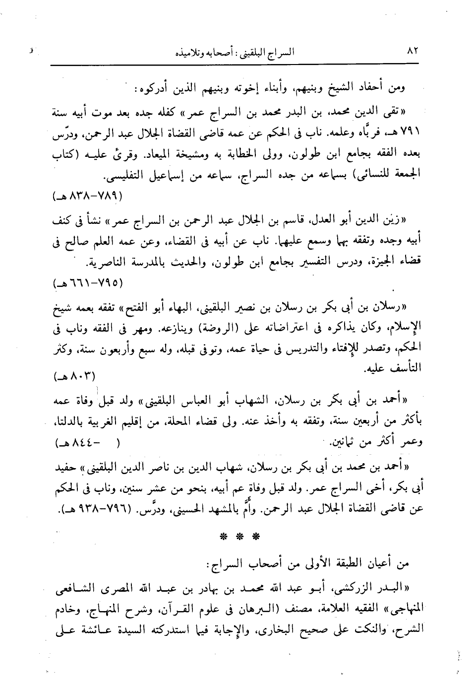 " رسلان بن أبي بكر بن رسلان بن نصير البلقيني، البهاء أبو الفتح " تفقه بعمه شيخ الإِسلام، وكان يذاكره في اعتراضاته على (الروضة) وينازعه. ومهر في الفقه وناب في الحكم، وتصدر للإِفتاء والتدريس في حياة عمه، وتوفي قبله، وله سبع وأربعون سنة، وكثر التأسف عليه.
