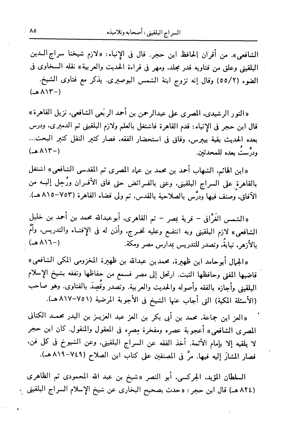 الشافعي ". من أقران الحافظ ابن حجر. قال في الإِنباء: " لازم شيخنا سراج الدين البلقيني وعلق من فتاويه قدر مجلد، ومهر في قراءة الحديث والعربية " نقله السخاوي في الضوء (2/ 55)، وقال إنه تزوج ابنة الشمس البوصيري. يذكر مع فتاوى الشيخ.