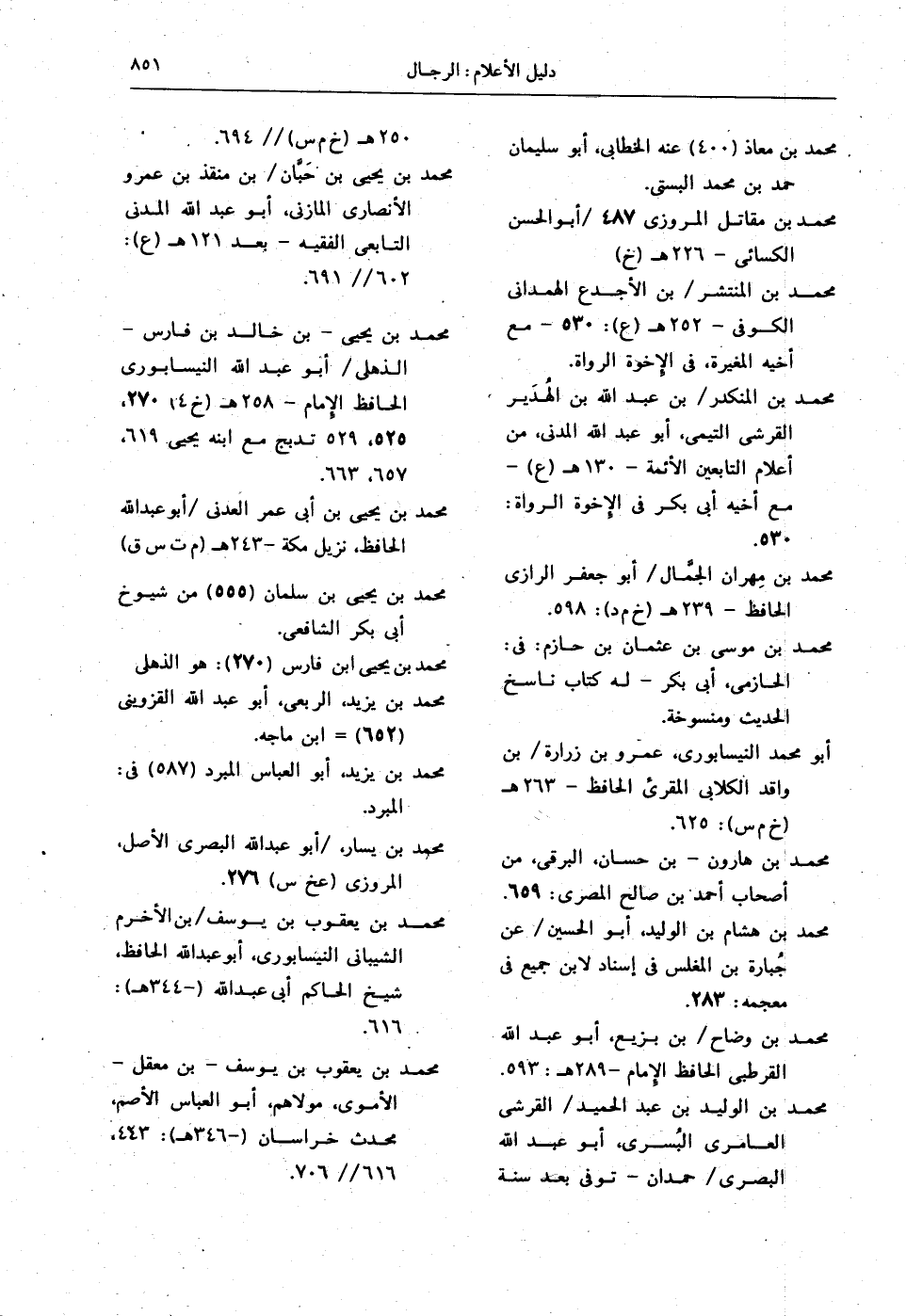 محمد بن يحيى - بن خالد بن فارس - الذهلي / أبو عبدالله النيسابوري الحافظ الإمام - 258 هـ (خ 4)، 270، 525، 529 تدبج مع أخيه يحيى 619، 657، 663.