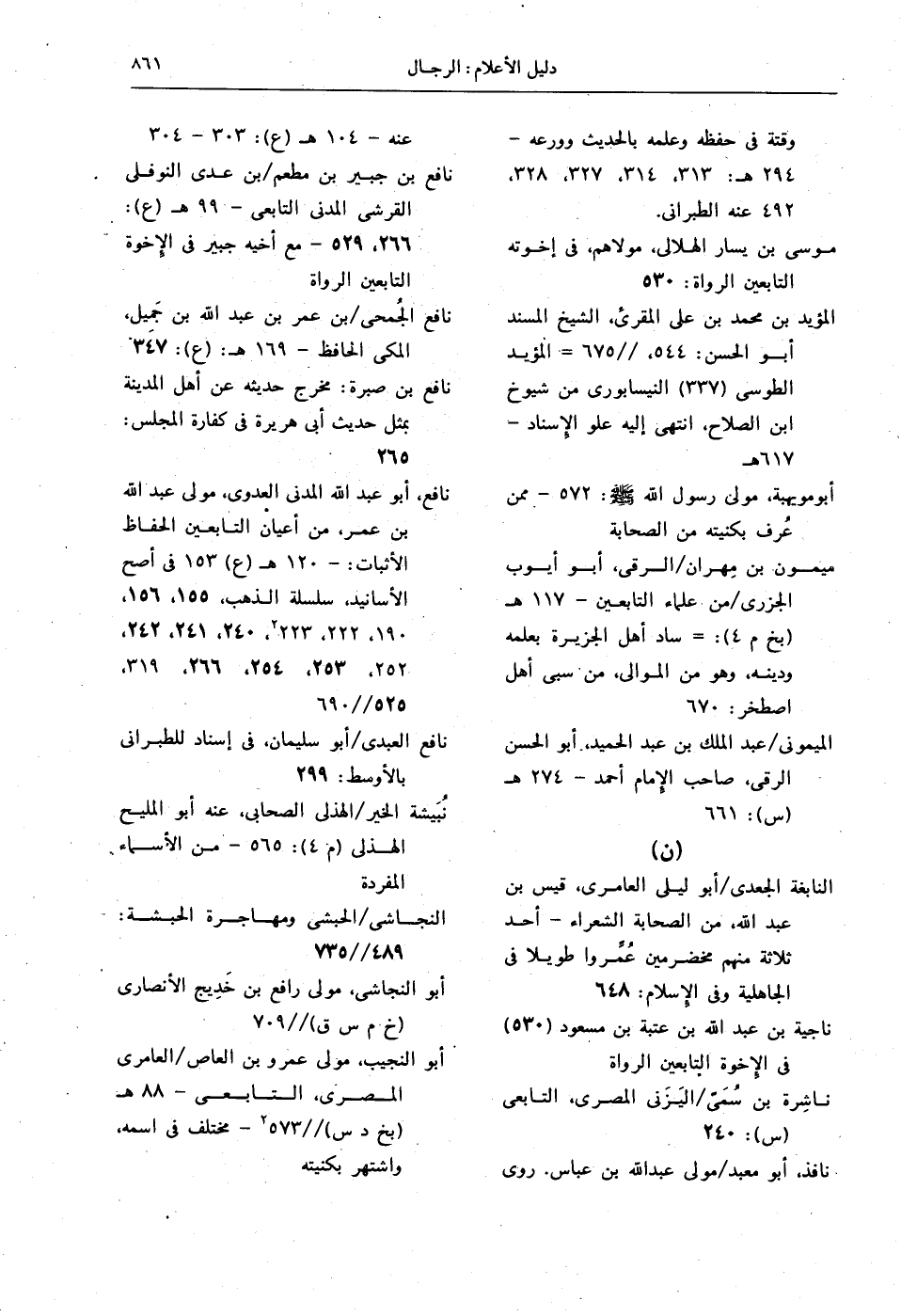 نافع، أبو عبدالله المدني العدوي، مولى عبدالله بن عمر، من أعيان التابعين الحفاظ الأثبات: - 120 هـ (ع) 153 في أصح الأسانيد، سلسلة الذهب، 155، 156، 190، 222، 223 ²، 240، 241، 242، 252، 253، 254، 266، 319، 525 // 690.