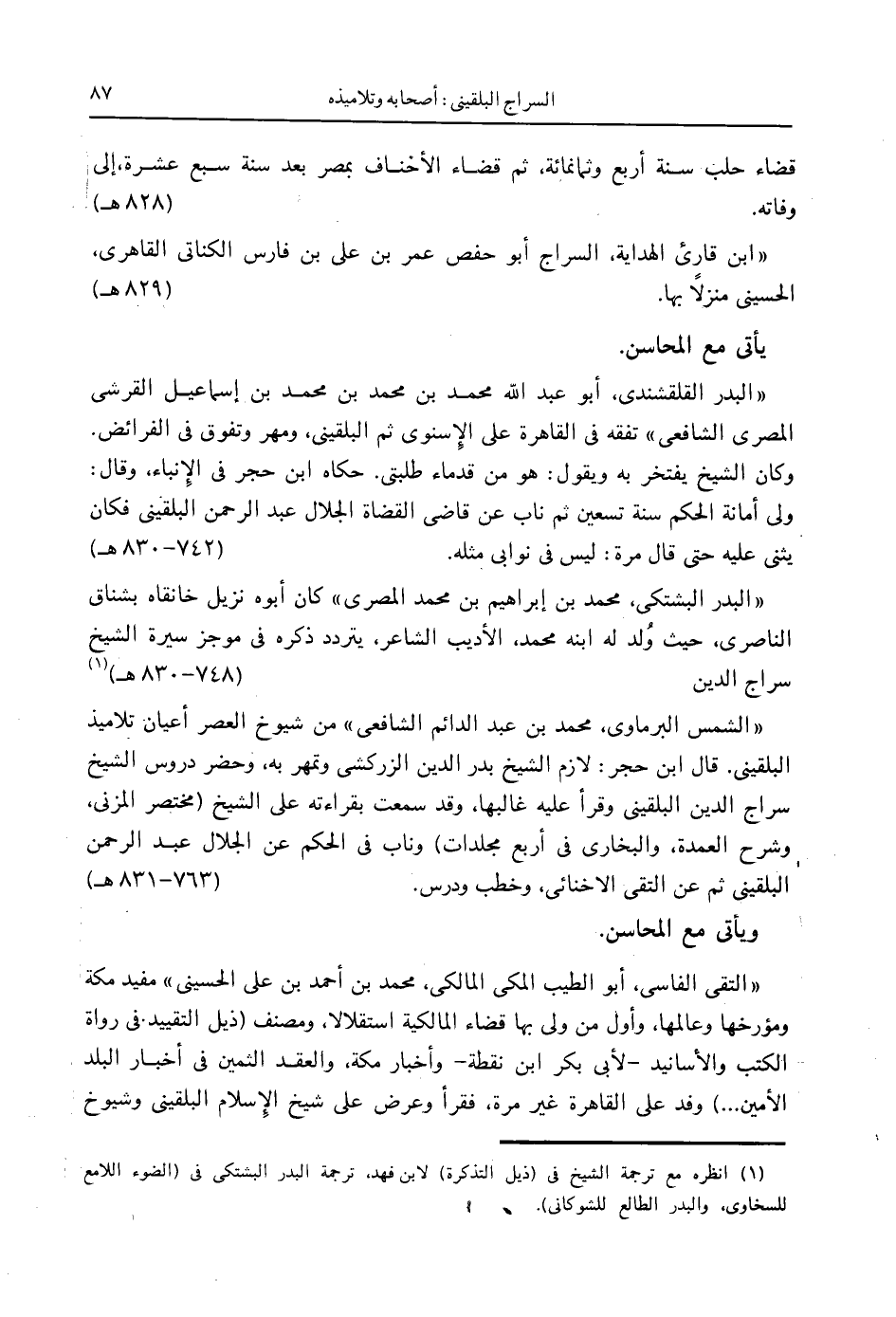 " البدر القلقشندي، أبو عبدالله محمد بن محمد بن محمد بن إسماعيل القرشي المصري الشافعي " تفقه في القاهرة على الإِسنوي ثم البلقيني، ومهر وتفوق في الفرائض. وكان الشيخ يفتخر به ويقول: هو من قدماء طلبتي. حكاه ابن حجر في الإِنباء، وقال: ولي أمانة الحكم سنة تسعين ثم ناب عن قاضي القضاة الجلال عبدالرحمن البلقيني فكان يثني عليه حتى قال مرة: ليس في نوابي مثله. (742 - 83 - هـ).