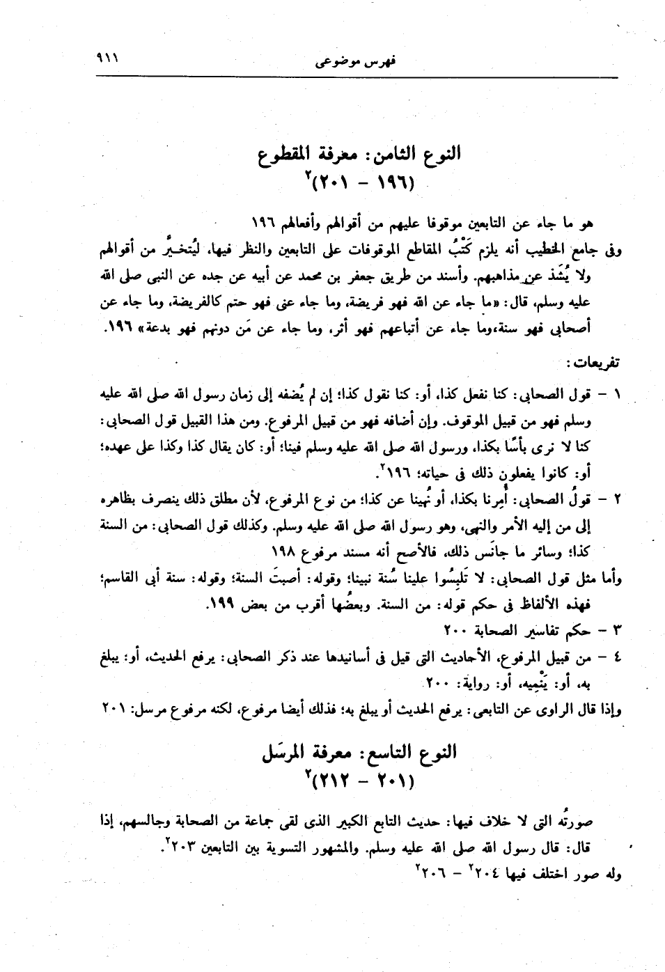 1 - قول الصحابي: كنا نفعل كذا، أو: كنا نقول كذا؛ إن لم يُضفه إلى زمان رسول الله - صلى الله عليه وسلم - فهو من قبيل الموقوف. وإن أضافه فهو من قبيل المرفوع. ومن هذا القبيل قول الصحابي: كنا لا نرى بأسًا بكذا، ورسول الله - صلى الله عليه وسلم - فينا، أو: كان يقال كذا وكذا على عهده، أو: كانوا يفعلون ذلك في حياته: 196 2.