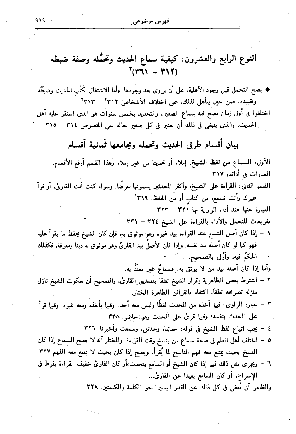 القسم الثاني: القراءة على الشيخ، وأكثر المحدثين يسمونها عرضًا. وسواء كنت أنت القارئ، أو قرأ غيرك وأنت تسمع، من كتابٍ أو من الحفظ. 319.