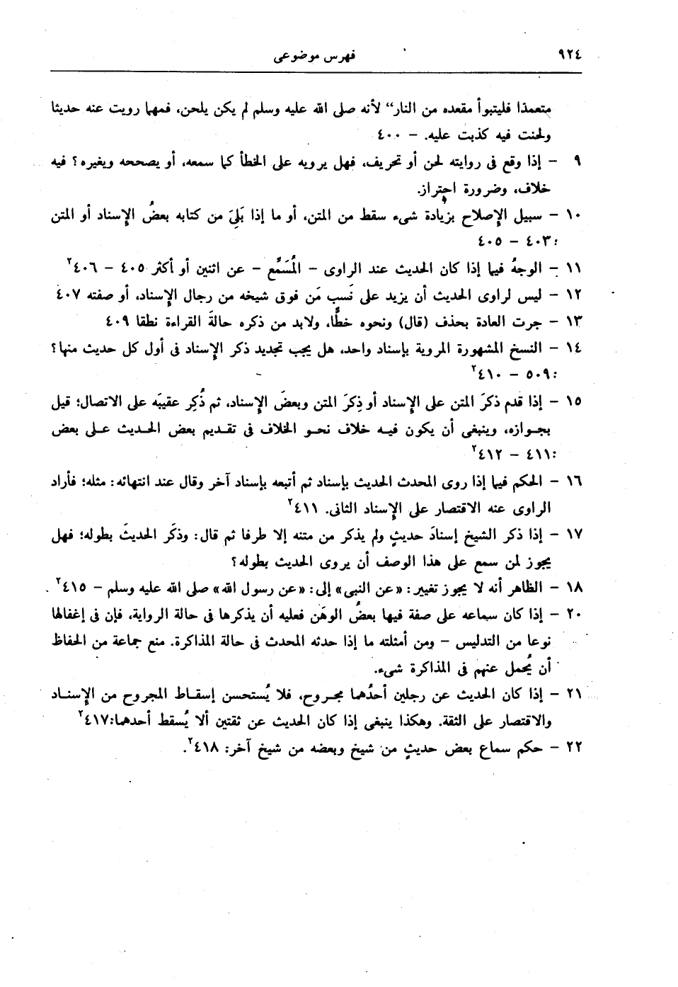 15 - إذا قدم ذكرَ المتن على الإسناد أو ذِكرَ المتن وبعضَ الإسناد، ثم ذُكِر عقيبَه على الاتصال؛ قيل بجوازه، وينبغي أن يكون فيه خلاف نحو الخلاف في تقديم بعض الحديث على بعض: 411 - 412 2.