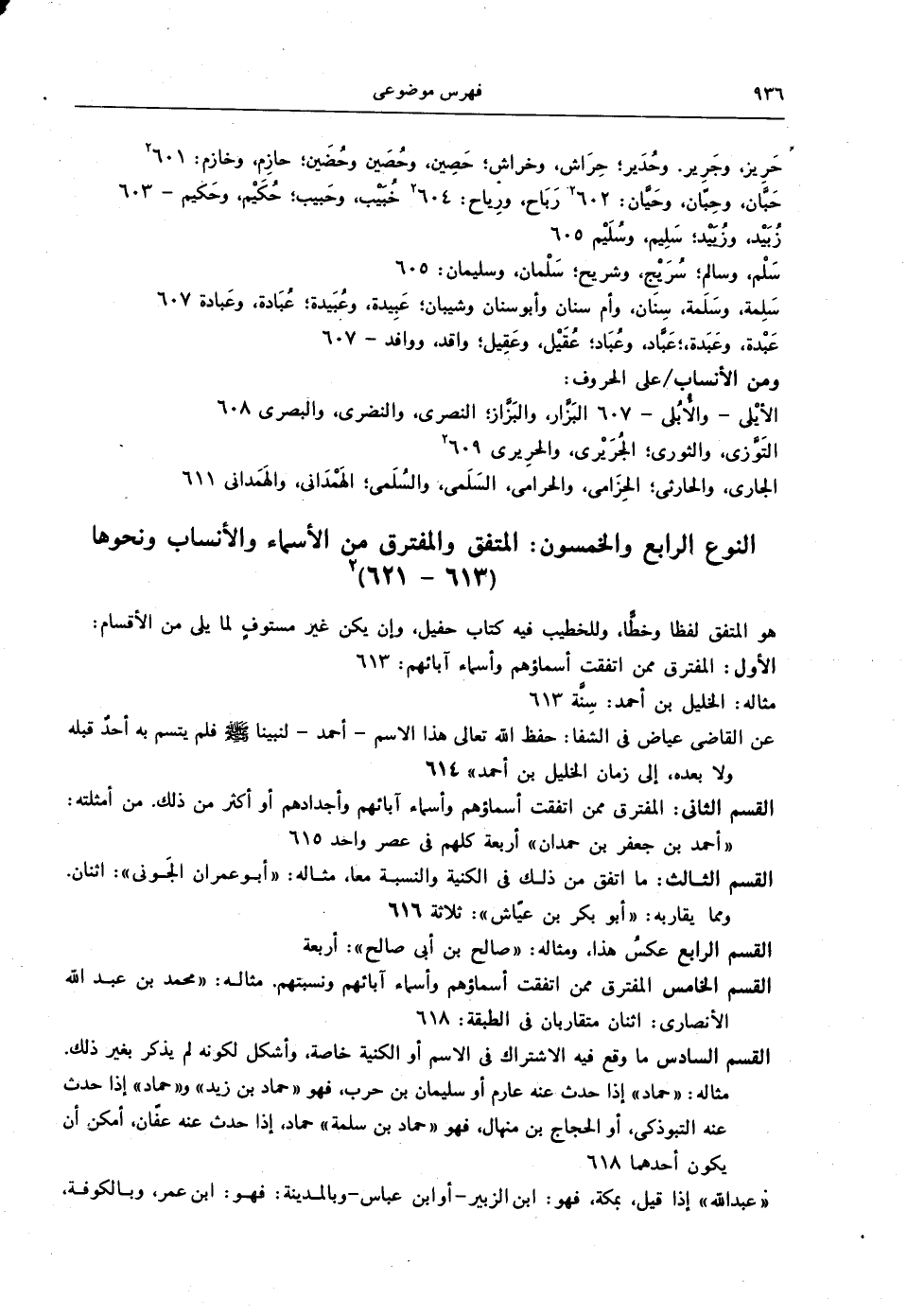 القسم الخامس: المفترق ممن اتفقت أسماؤهم وأسماء آبائهم ونسبتهم. مثاله: " محمد بن عبد الله الأنصاري ": اثنان متقاربان في الطبقة: 618.