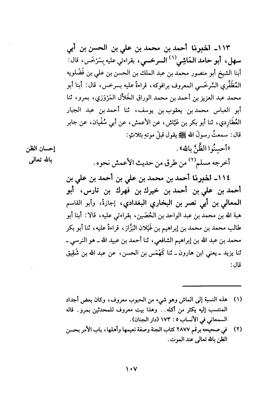 113- أخبرنا أحمد بن محمد بن علي بن الحسن بن أبي سهل أبو حامد الماشي السرخسي بقراءتي عليه بسرخس قال أبنا الشيخ أبو منصور محمد بن عبد الملك بن الحسن بن علي بن فضلويه المظفري السرخسي المعروف برافوكه قراءة عليه بسرخس قال أبنا أبو محمد عبد العزيز بن أحمد بن محمد الوراق الخلال المروزي بمرو ثنا أبو العباس محمد بن يعقوب بن يوسف ثنا أحمد بن عبد الجبار العطاردي ثنا أبو بكر بن عياش عن الأعمش عن أبي سفيان عن جابر قال سمعت رسول الله صلى الله عليه وسلم يقول قبل موته بثلاث أحسنوا الظن بالله.