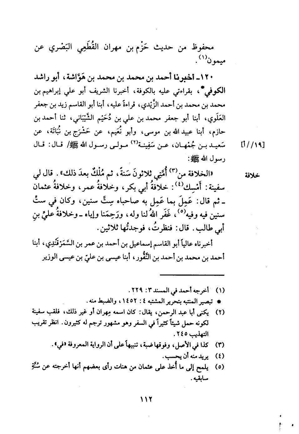 120- أخبرنا أحمد بن محمد بن محمد بن هواشة أبو راشد الكوفي بقراءتي عليه بالكوفة أخبرنا الشريف أبو علي إبراهيم بن محمد بن محمد بن أحمد الزيدي قراءة عليه أبنا أبو القاسم زيد بن جعفر العلوي أبنا أبو جعفر محمد بن علي بن دحيم الشيباني ثنا أحمد بن حازم أبنا عبيد الله بن موسى وأبو نعيم عن حشرج بن نباتة عن سعيد بن جمهان عن سفينة مولى رسول الله صلى الله عليه وسلم قال قال رسول الله صلى الله عليه وسلم الخلافة من أمتي ثلاثون سنة ثم ملك بعد ذلك قال لي سفينة أمسك خلافة أبي بكر وخلافة عمر وخلافة عثمان ثم قال عمل بما عمل به صاحباه ست سنين وكان في ست سنين فيه وفيه غفر الله لنا وله ورحمنا وإياه وخلافة علي بن أبي طالب قال فنظرت فوجدتها ثلاثين. أخبرناه عاليا أبو القاسم إسماعيل بن أحمد بن عمر بن السمرقندي أبنا أحمد بن محمد بن أحمد بن النقور أبنا عيسى بن علي بن عيسى الوزير -[113]- ح وأخبرنا إسماعيل بن أحمد أبنا عبد الله بن محمد الصريفيني أبنا عبيد الله بن محمد بن حبابة قالا أبنا عبد الله بن محمد بن عبد العزيز ثنا علي بن الجعد أبنا حماد بن سلمة عن سعيد بن جمهان عن سفينة قال سمعت النبي صلى الله عليه وسلم يقول الخلافة ثلاثون سنة ثم تكون ملكا ثم قال أمسك خلافة أبي بكر سنتان وعمر عشرة وعثمان ثنتا عشرة وعلي ستا رضي الله عنهم قال علي قلت لحماد سفينة القائل لسعيد أمسك قال نعم.