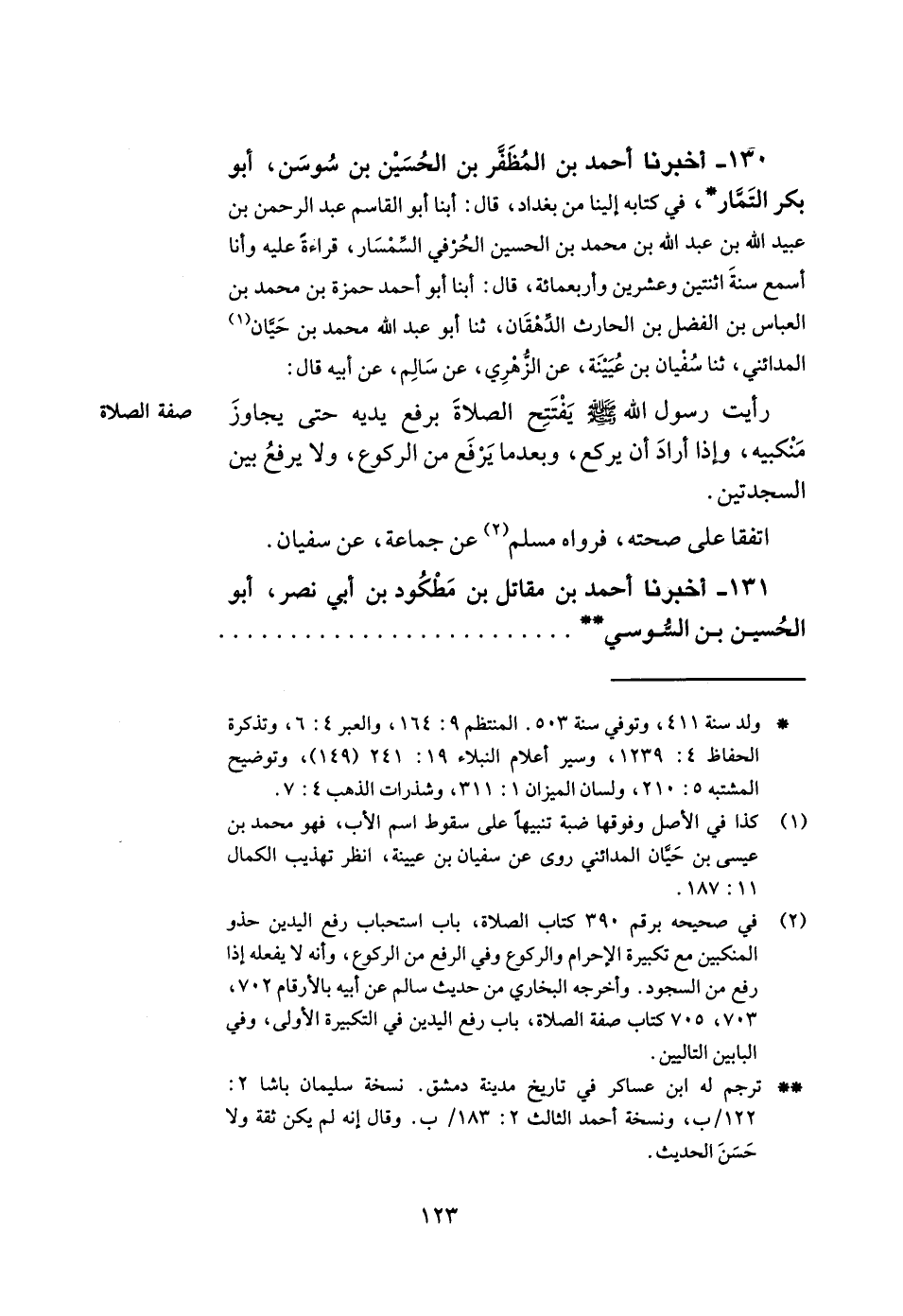 130- أخبرنا أحمد بن المظفر بن الحسين بن سوسن أبو بكر التمار في كتابه إلينا من بغداد قال أبنا أبو القاسم عبد الرحمن بن عبيد الله بن عبد الله بن محمد بن الحسين الحرفي السمسار قراءة عليه وأنا أسمع سنة اثنتين وعشرين وأربعمائة قال أبنا أبو أحمد حمزة بن محمد بن العباس بن الفضل بن الحارث الدهقان ثنا أبو عبد الله محمد بن حيان المدائني ثنا سفيان بن عيينة عن الزهري عن سالم عن أبيه قال رأيت رسول الله صلى الله عليه وسلم يفتتح الصلاة برفع يديه حتى يجاوز منكبيه وإذا أراد أن يركع وبعدما يرفع من الركوع ولا يرفع بين السجدتين.