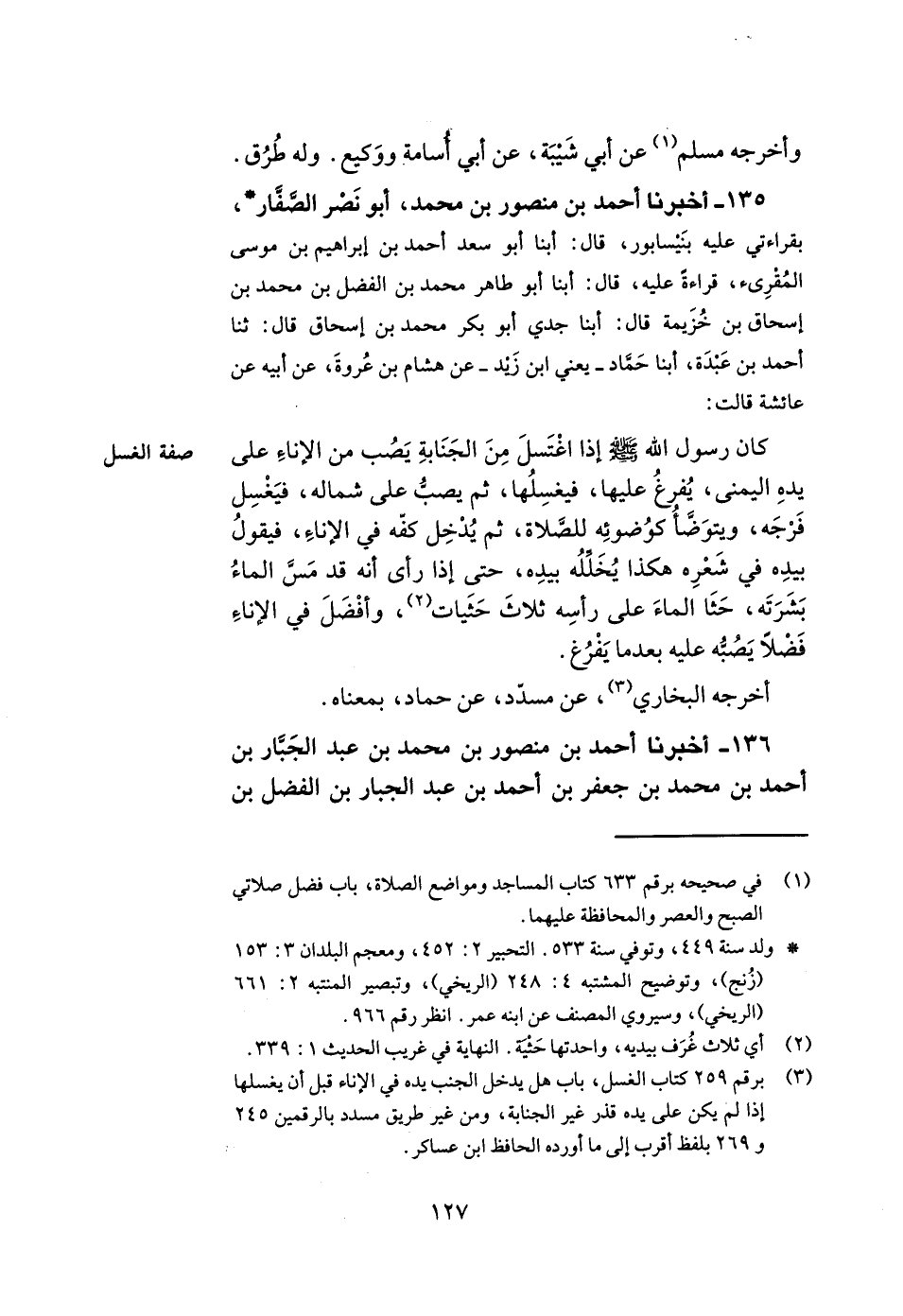135- أخبرنا أحمد بن منصور بن محمد أبو نصر الصفار بقراءتي عليه بنيسابور قال أبنا أبو سعد أحمد بن إبراهيم بن موسى المقرئ قراءة عليه قال أبنا أبو طاهر محمد بن الفضل بن محمد بن إسحاق بن خزيمة قال أبنا جدي أبو بكر محمد بن إسحاق قال ثنا أحمد بن عبدة أبنا حماد يعني ابن زيد عن هشام بن عروة عن أبيه عن عائشة قالت كان رسول الله صلى الله عليه وسلم إذا اغتسل من الجنابة يصب من الإناء على يده اليمنى يفرغ عليها فيغسلها ثم يصب على شماله فيغسل فرجه ويتوضأ كوضوئه للصلاة ثم يدخل كفه في الإناء فيقول بيده في شعره هكذا يخلله بيده حتى إذا رأى أنه قد مس الماء بشرته حثا الماء على رأسه ثلاث حثيات وأفضل في الإناء فضلا يصبه عليه بعدما يفرغ.