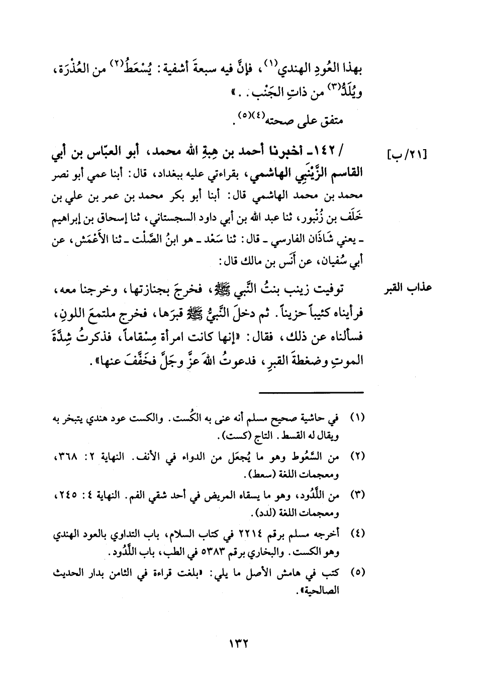 142- أخبرنا أحمد بن هبة الله محمد أبو العباس بن أبي القاسم الزينبي الهاشمي بقراءتي عليه ببغداد قال أبنا عمي أبو نصر محمد بن محمد الهاشمي قال أبنا أبو بكر محمد بن عمر بن علي بن خلف بن زنبور ثنا عبد الله بن أبي داود السجستاني ثنا إسحاق بن إبراهيم يعني شاذان الفارسي قال ثنا سعد هو ابن الصلت ثنا الأعمش عن أبي سفيان عن أنس بن مالك قال توفيت زينب بنت النبي صلى الله عليه وسلم فخرج بجنازتها وخرجنا معه فرأيناه كئيبا حزينا ثم دخل النبي صلى الله عليه وسلم قبرها فخرج ملتمع اللون فسألناه عن ذلك فقال: إنها كانت امرأة مسقاما فذكرت شدة الموت وضغطة القبر فدعوت الله عز وجل فخفف عنها. -[133]- أبو سفيان طلحة بن نافع القرشي المكي