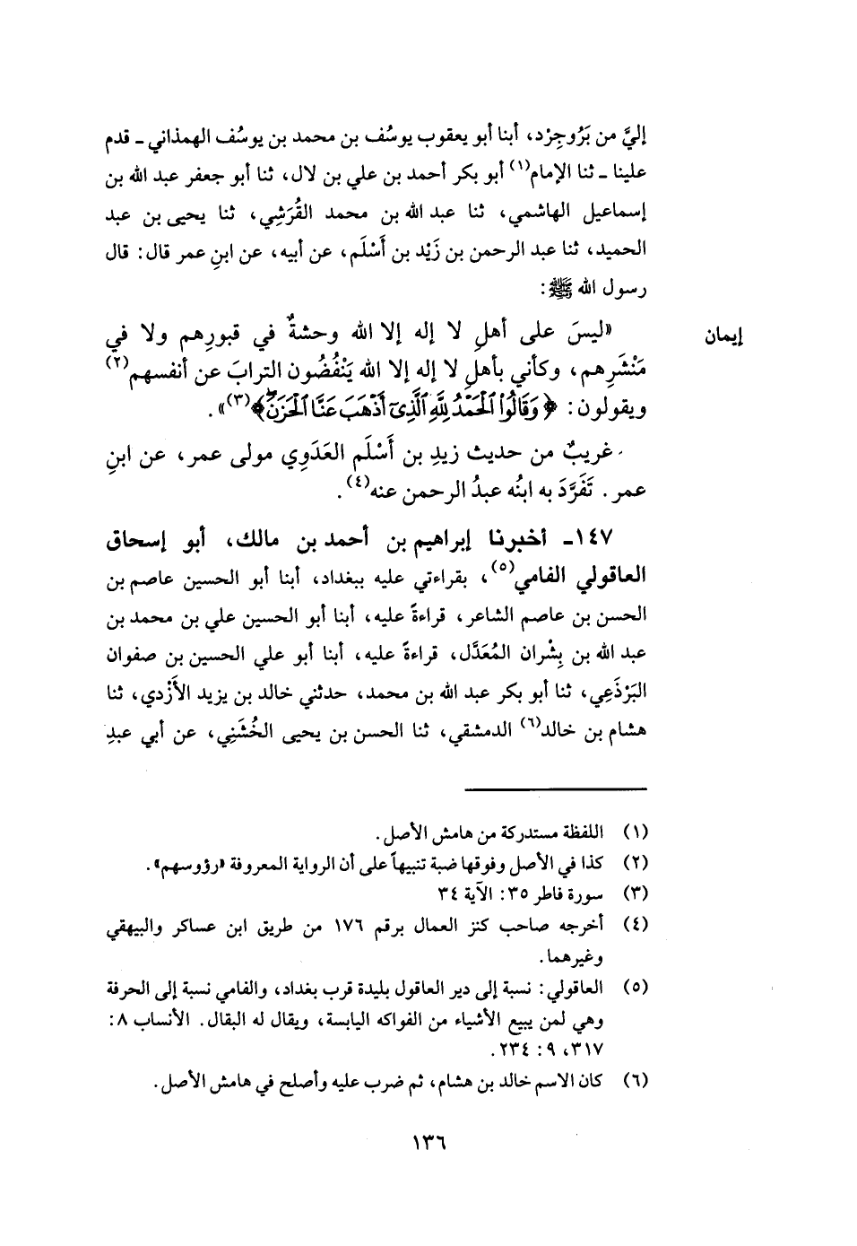 147- أخبرنا إبراهيم بن أحمد بن مالك أبو إسحاق العاقولي الفامي بقراءتي عليه ببغداد أبنا أبو الحسين عاصم بن الحسن بن عاصم الشاعر قراءة عليه أبنا أبو الحسين علي بن محمد بن عبد الله بن بشران المعدل قراءة عليه أبنا أبو علي الحسين بن صفوان البرذعي ثنا أبو بكر عبد الله بن محمد حدثني خالد بن يزيد الأزدي ثنا هشام بن خالد الدمشقي ثنا الحسن بن يحيى الخشني عن أبي عبد -[137]- ربه عن أنس بن مالك قال خرجنا مع رسول الله صلى الله عليه وسلم إلى وادي العقيق فقال: يا أنس خذ هذه المطهرة املأها من هذا الوادي فإنه واد يحبنا ونحبه. فأخذتها فملأتها وعجلت فلحقت برسول الله صلى الله عليه وسلم وهو آخذ بيد علي رضي الله عنه فلما أن سمع حسي التفت إلي فقال: يا أنس فعلت ما أمرتك به. قلت نعم يا رسول الله فأقبل على علي فقال: ما من حبرة إلا ستتبعها عبرة يا علي كل هم منقطع إلا هم النار يا علي كل نعيم يزول إلا نعيم الجنة.