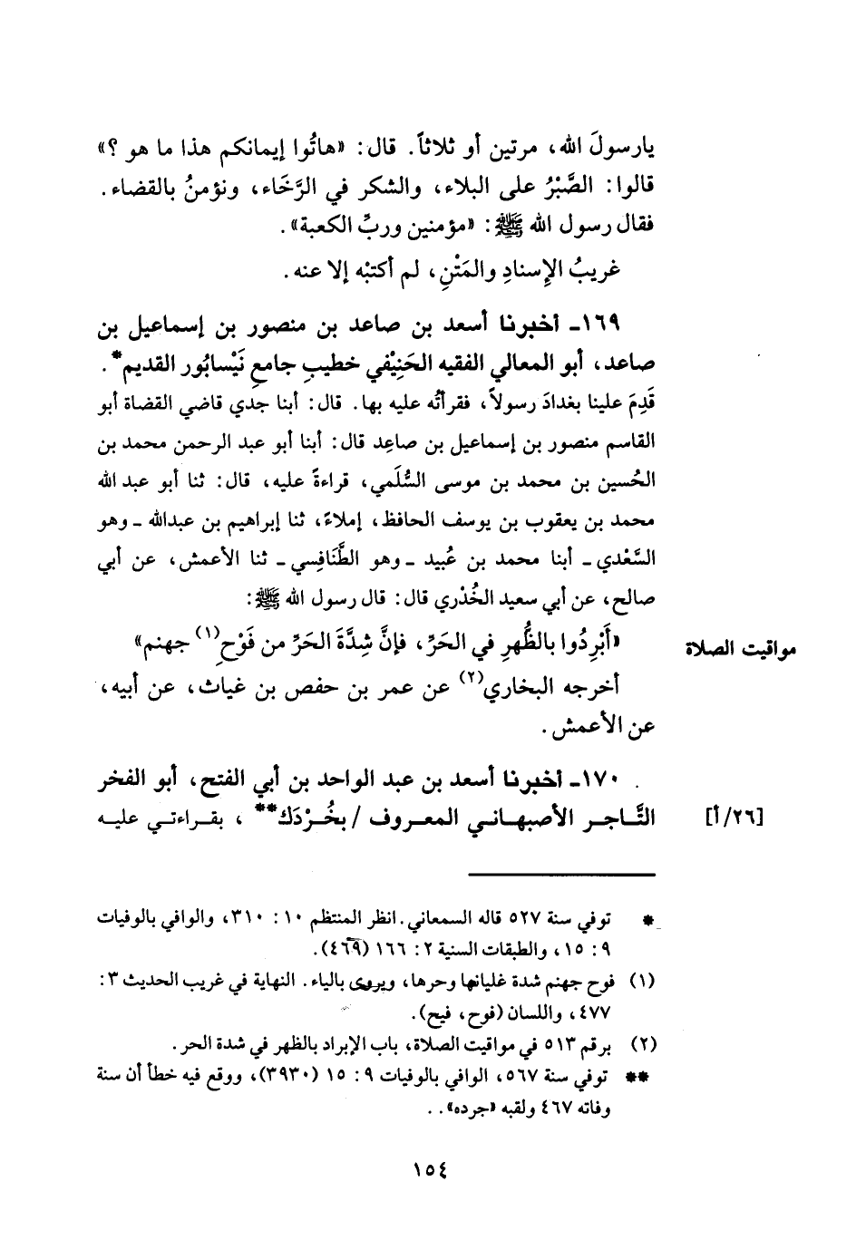 169- أخبرنا أسعد بن صاعد بن منصور بن إسماعيل بن صاعد أبو المعالي الفقيه الحنيفي خطيب جامع نيسابور القديم قدم علينا بغداد رسولا فقرأته عليه بها قال أبنا جدي قاضي القضاة أبو القاسم منصور بن إسماعيل بن صاعد قال أبنا أبو عبد الرحمن محمد بن الحسين بن محمد بن موسى السلمي قراءة عليه قال ثنا أبو عبد الله محمد بن يعقوب بن يوسف الحافظ إملاء ثنا إبراهيم بن عبد الله وهو السعدي أبنا محمد بن عبيد وهو الطنافسي ثنا الأعمش عن أبي صالح عن أبي سعيد الخدري قال قال رسول الله صلى الله عليه وسلم أبردوا بالظهر في الحر فإن شدة الحر من فوح جهنم.