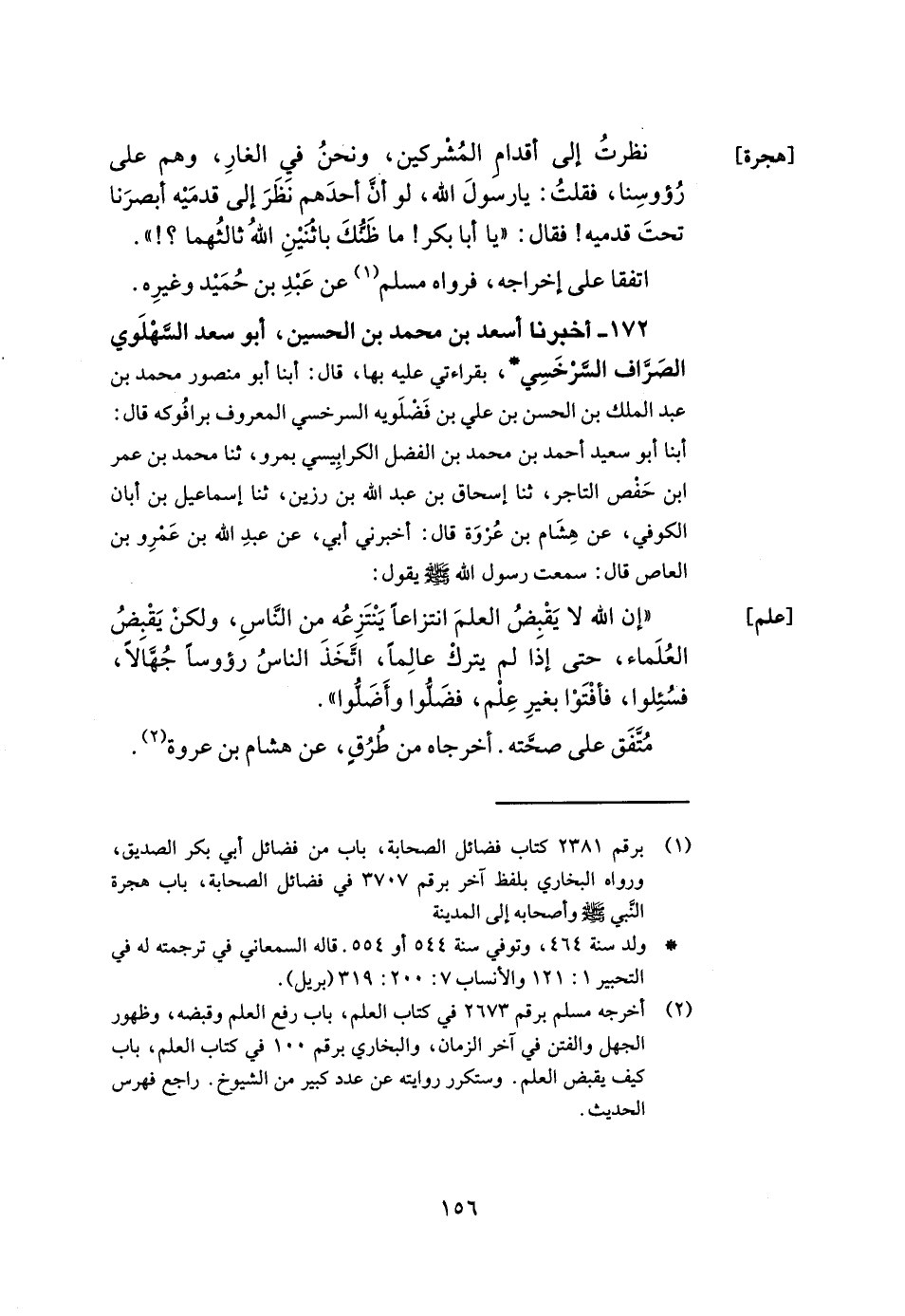 172- أخبرنا أسعد بن محمد بن الحسين أبو سعد السهلوي الصراف السرخسي بقراءتي عليه بها قال أبنا أبو منصور محمد بن عبد الملك بن الحسن بن علي بن فضلويه السرخسي المعروف برافوكه قال أبنا أبو سعيد أحمد بن محمد بن الفضل الكرابيسي بمرو ثنا محمد بن عمر بن حفص التاجر ثنا إسحاق بن عبد الله بن رزين ثنا إسماعيل بن أبان الكوفي عن هشام بن عروة قال أخبرني أبي عن عبد الله بن عمرو بن العاص قال سمعت رسول الله صلى الله عليه وسلم يقول إن الله لا يقبض العلم انتزاعا ينتزعه من الناس ولكن يقبض العلماء حتى إذا لم يترك عالما اتخذ الناس رؤوسا جهالا فسئلوا فأفتوا بغير علم فضلوا وأضلوا.
