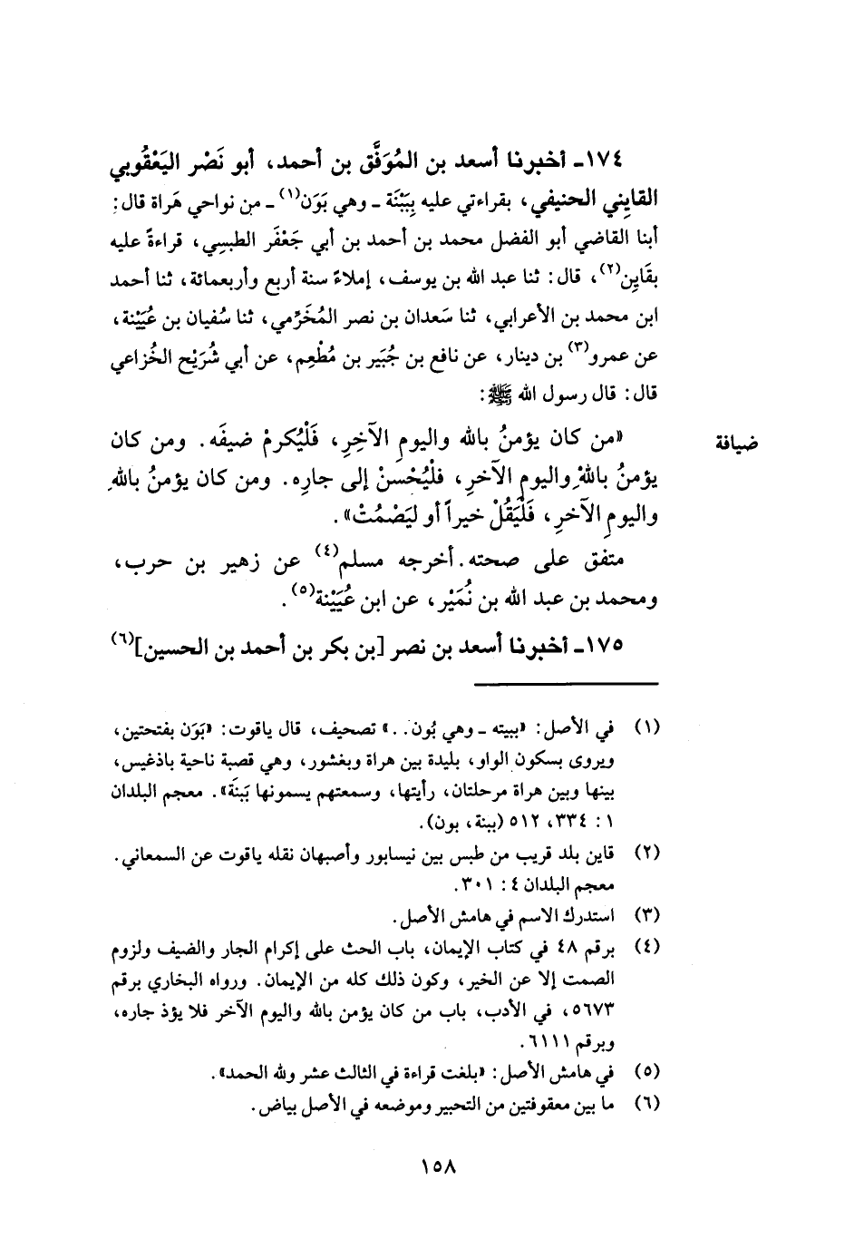 174- أخبرنا أسعد بن الموفق بن أحمد أبو نصر اليعقوبي القايني الحنيفي بقراءتي عليه بببنة وهي بون من نواحي هراة قال أبنا القاضي أبو الفضل محمد بن أحمد بن أبي جعفر الطبسي قراءة عليه بقاين قال ثنا عبد الله بن يوسف إملاء سنة أربع وأربعمائة ثنا أحمد بن محمد بن الأعرابي ثنا سعدان بن نصر المخرمي ثنا سفيان بن عيينة عن عمرو بن دينار عن نافع بن جبير بن مطعم عن أبي شريح الخزاعي قال قال رسول الله صلى الله عليه وسلم من كان يؤمن بالله واليوم الآخر فليكرم ضيفه ومن كان يؤمن بالله واليوم الآخر فليحسن إلى جاره ومن كان يؤمن بالله واليوم الآخر فليقل خيرا أو ليصمت.