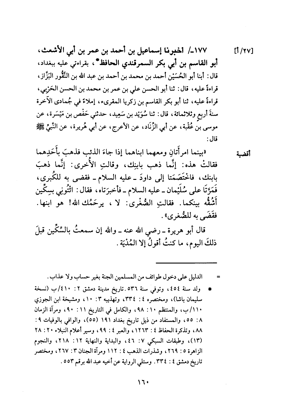 177- أخبرنا إسماعيل بن أحمد بن عمر بن أبي الأشعث أبو القاسم بن أبي بكر السمرقندي الحافظ بقراءتي عليه ببغداد قال أبنا أبو الحسين أحمد بن محمد بن أحمد بن عبد الله بن النقور البزاز قراءة عليه قال ثنا أبو الحسن علي بن عمر بن محمد بن الحسن الحربي قراءة عليه ثنا أبو بكر القاسم بن زكريا المقرئ إملاء في جمادى الآخرة سنة أربع وثلاثمائة قال ثنا سويد بن سعيد حدثني حفص بن ميسرة عن موسى بن عقبة عن أبي الزناد عن الأعرج عن أبي هريرة عن النبي صلى الله عليه وسلم قال بينما امرأتان ومعهما ابناهما إذ جاء الذئب فذهب بأحدهما فقالت هذه إنما ذهب بابنك وقالت الأخرى إنما ذهب بابنك فاختصمتا إلى داود عليه السلام فقضى به للكبرى فمرتا على سليمان عليه السلام فأخبرتاه فقال ائتوني بسكين أشقه بينكما فقالت الصغرى لا يرحمك الله هو ابنها فقضى به للصغرى. قال أبو هريرة رضي الله عنه والله إن سمعت بالسكين قبل ذلك اليوم ما كنت أقول إلا المدية.