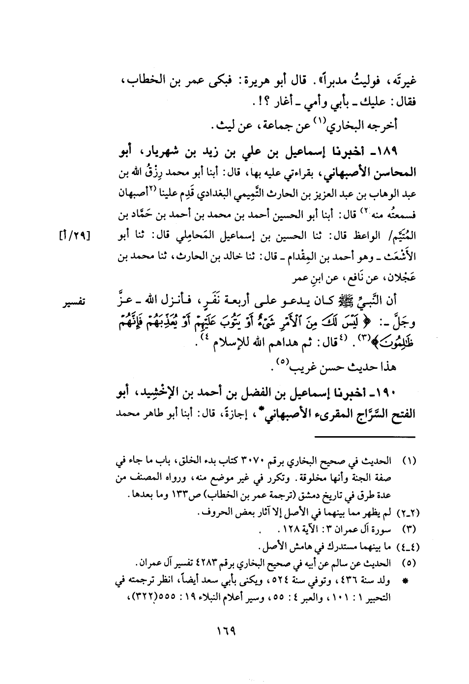 189- أخبرنا إسماعيل بن علي بن زيد بن شهريار أبو المحاسن الأصبهاني بقراءتي عليه بها قال أبنا أبو محمد رزق الله بن عبد الوهاب بن عبد العزيز بن الحارث التميمي البغدادي قدم علينا أصبهان فسمعته منه قال أبنا أبو الحسين أحمد بن محمد بن أحمد بن حماد بن المتيم الواعظ قال ثنا الحسين بن إسماعيل المحاملي قال ثنا أبو الأشعث وهو أحمد بن المقدام قال ثنا خالد بن الحارث ثنا محمد بن عجلان عن نافع عن ابن عمر أن النبي صلى الله عليه وسلم كان يدعو على أربعة نفر فأنزل الله عز وجل: {ليس لك من الأمر شيء أو يتوب عليهم أو يعذبهم فإنهم ظالمون} . قال ثم هداهم الله للإسلام.