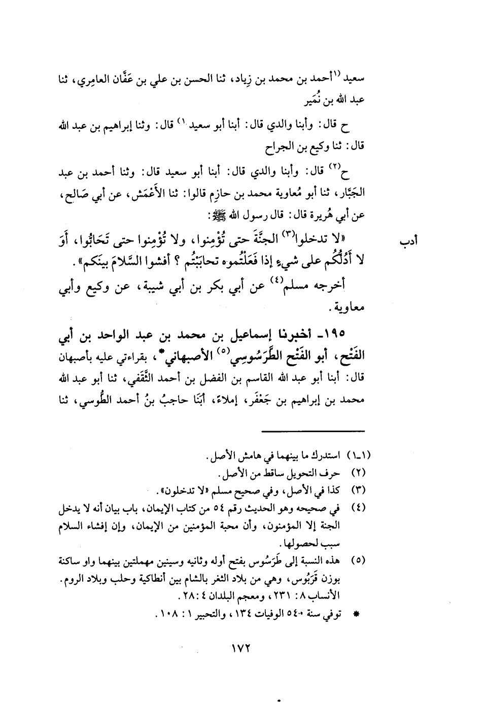 195- أخبرنا إسماعيل بن محمد بن عبد الواحد بن أبي الفتح أبو الفتح الطرسوسي الأصبهاني بقراءتي عليه بأصبهان قال أبنا أبو عبد الله القاسم بن الفضل بن أحمد الثقفي ثنا أبو عبد الله محمد بن إبراهيم بن جعفر إملاء أبنا حاجب بن أحمد الطوسي ثنا -[173]- محمد بن حماد الأبيوردي الغازي ثنا أبو معاوية الضرير عن الأعمش عن عبد الله بن مرة عن أبي الأحوص عن عبد الله قال رسول الله صلى الله عليه وسلم إني أبرأ إلى كل خليل من خلته غير أن الله تعالى قد اتخذ صاحبكم خليلا يعني نفسه ولو كنت متخذا خليلا لاتخذت أبا بكر خليلا.