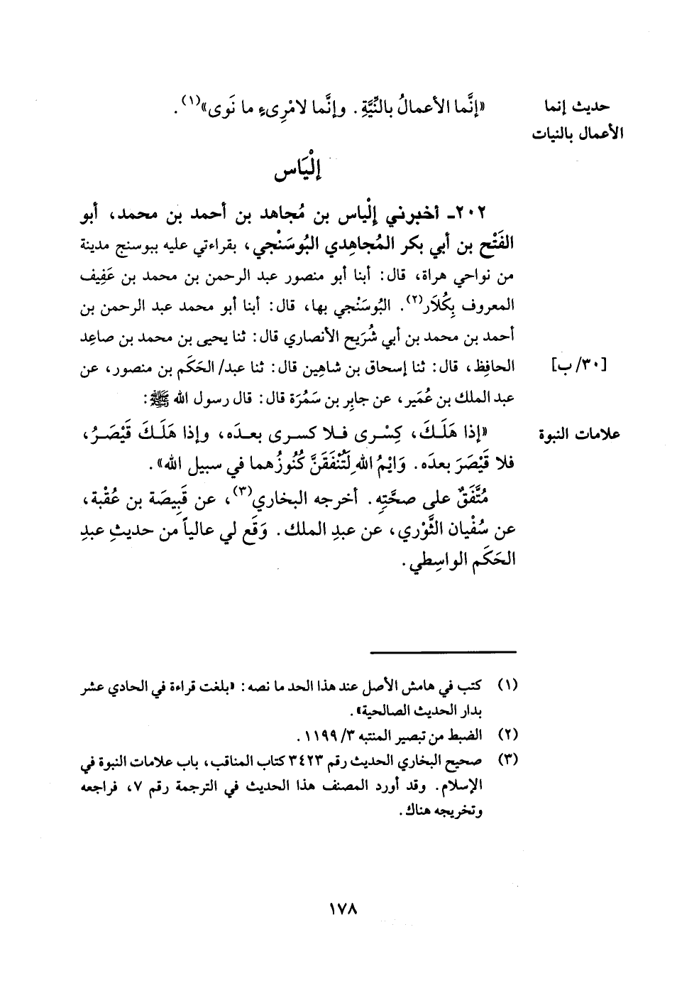 202- أخبرني إلياس بن مجاهد بن أحمد بن محمد أبو الفتح بن أبي بكر المجاهدي البوسنجي بقراءتي عليه ببوسنج مدينة من نواحي هراة قال أبنا أبو منصور عبد الرحمن بن محمد بن عفيف المعروف بكلار البوسنجي بها قال أبنا أبو محمد عبد الرحمن بن أحمد بن محمد بن أبي شريح الأنصاري قال ثنا يحيى بن محمد بن صاعد الحافظ قال ثنا إسحاق بن شاهين قال ثنا عبد الحكم بن منصور عن عبد الملك بن عمير عن جابر بن سمرة قال قال رسول الله صلى الله عليه وسلم إذا هلك كسرى فلا كسرى بعده وإذا هلك قيصر فلا قيصر بعده وايم الله لتنفقن كنوزهما في سبيل الله. متفق على صحته أخرجه البخاري عن قبيصة بن عقبة عن سفيان الثوري عن عبد الملك وقع لي عاليا من حديث عبد الحكم الواسطي.