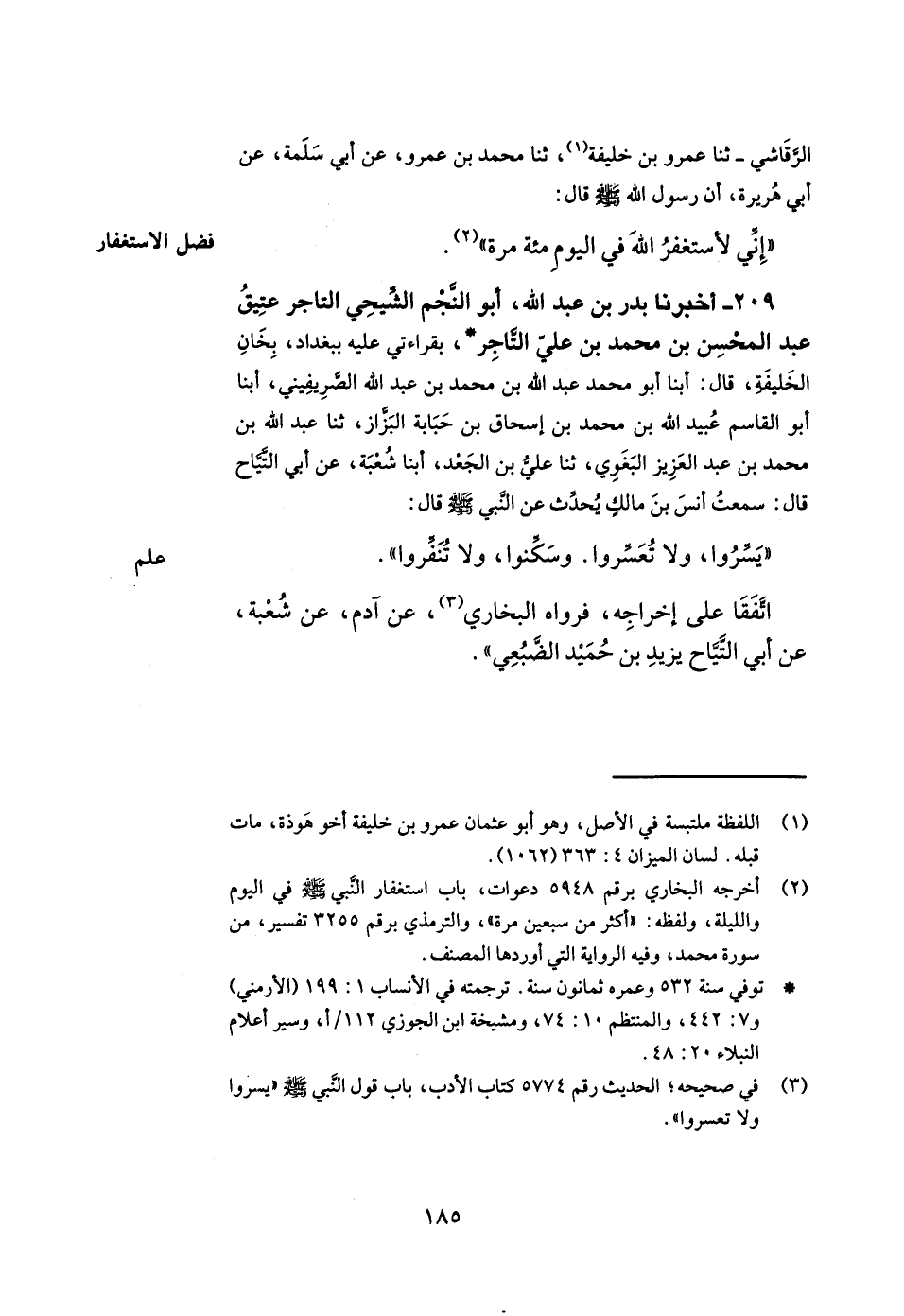 209- أخبرنا بدر بن عبد الله أبو النجم الشيحي التاجر عتيق عبد المحسن بن محمد بن علي التاجر بقراءتي عليه ببغداد بخان الخليفة قال أبنا أبو محمد عبد الله بن محمد بن عبد الله الصريفيني أبنا أبو القاسم عبيد الله بن محمد بن إسحاق بن حبابة البزاز ثنا عبد الله بن محمد بن عبد العزيز البغوي ثنا علي بن الجعد أبنا شعبة عن أبي التياح قال سمعت أنس بن مالك يحدث عن النبي صلى الله عليه وسلم قال يسروا ولا تعسروا وسكنوا لا تنفروا.