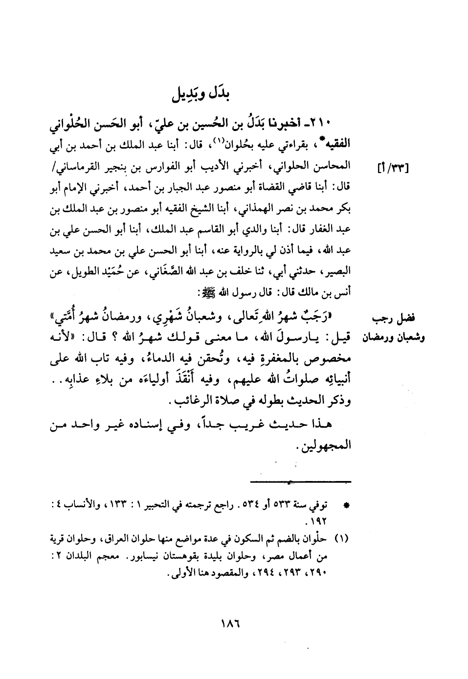 210- أخبرنا بدل بن الحسين بن علي أبو الحسن الحلواني الفقيه بقراءتي عليه بحلوان قال أبنا عبد الملك بن أحمد بن أبي المحاسن الحلواني أخبرني الأديب أبو الفوارس بن بنجير القرماساني قال أبنا قاضي القضاة أبو منصور عبد الجبار بن أحمد أخبرني الإمام أبو بكر محمد بن نصر الهمذاني أبنا الشيخ الفقيه أبو منصور بن عبد الملك بن عبد الغفار قال أبنا والدي أبو القاسم عبد الملك أبنا أبو الحسن علي بن عبد الله فيما أذن لي بالرواية عنه أبنا أبو الحسن علي بن محمد بن سعيد البصير حدثني أبي ثنا خلف بن عبد الله الصغاني عن حميد الطويل عن أنس بن مالك قال قال رسول الله صلى الله عليه وسلم: رجب شهر الله تعالى وشعبان شهري ورمضان شهر أمتي. قيل يا رسول الله ما معنى قولك شهر الله قال: لأنه مخصوص بالمغفرة فيه وتحقن فيه الدماء وفيه تاب الله على أنبيائه صلوات الله عليهم وفيه أنقذ أولياءه من بلاء عذابه.. وذكر الحديث بطوله في صلاة الرغائب.