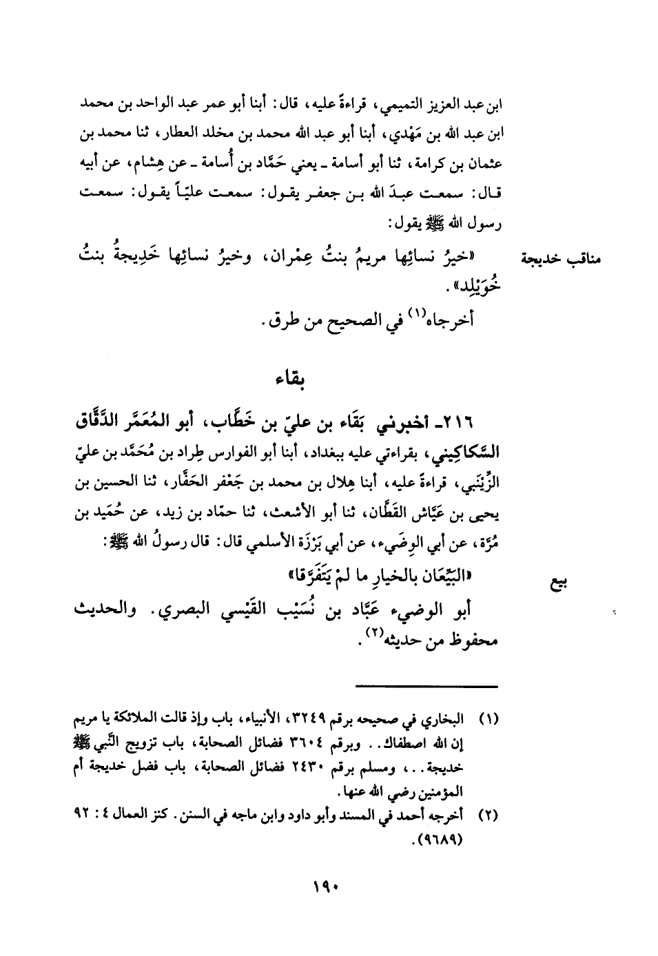 216- أخبرني بقاء بن علي بن خطاب أبو المعمر الدقاق السكاكيني بقراءتي عليه ببغداد أبنا أبو الفوارس طراد بن محمد بن علي الزينبي قراءة عليه أبنا هلال بن محمد بن جعفر الحفار ثنا الحسين بن يحيى بن عياش القطان ثنا أبو الأشعث ثنا حماد بن زيد عن حميد بن مرة عن أبي الوضيء عن أبي برزة الأسلمي قال قال رسول الله صلى الله عليه وسلم البيعان بالخيار ما لم يتفرقا. أبو الوضيء عباد بن نسيب القيسي البصري