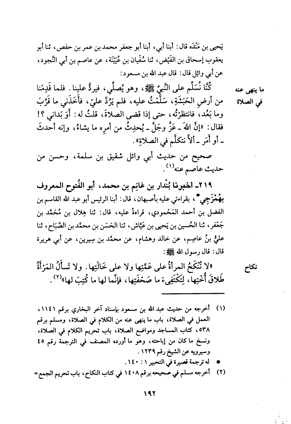 219- أخبرنا بندار بن غانم بن محمد أبو الفتوح المعروف بهمزجي بقراءتي عليه بأصبهان قال أبنا الرئيس أبو عبد الله القاسم بن الفضل بن أحمد المحمودي قراءة عليه قال ثنا هلال بن محمد بن جعفر ثنا الحسين بن يحيى بن عياش ثنا الحسن بن محمد بن الصباح ثنا علي بن عاصم عن خالد وهشام عن محمد بن سيرين عن أبي هريرة قال قال رسول الله صلى الله عليه وسلم لا تنكح المرأة على عمتها ولا على خالتها ولا تسأل المرأة طلاق أختها لتكتفئ ما صحفتها فإنما لها ما كتب لها.