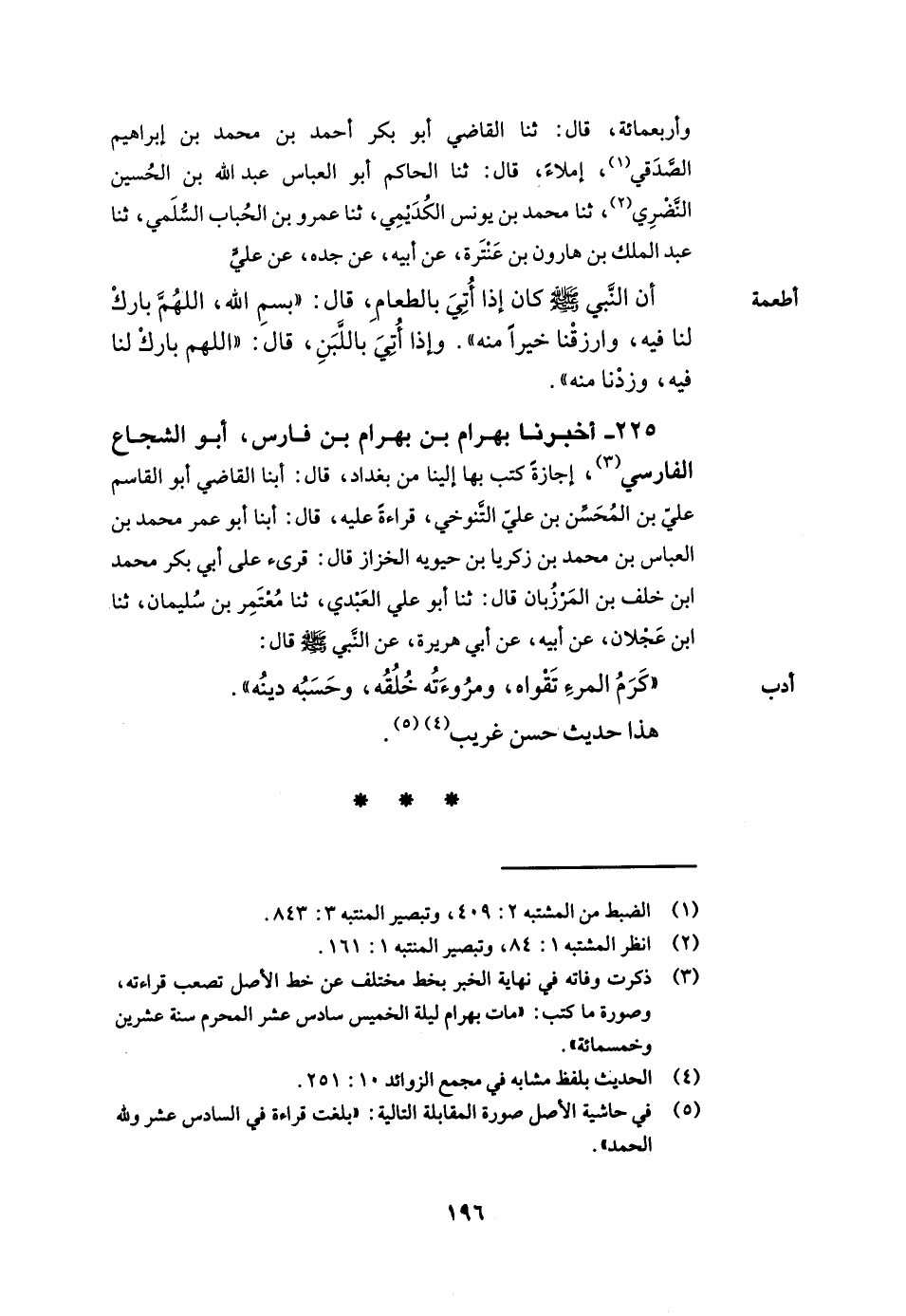 225- أخبرنا بهرام بن بهرام بن فارس أبو الشجاع الفارسي إجازة كتب بها إلينا من بغداد قال أبنا القاضي أبو القاسم علي بن المحسن بن علي التنوخي قراءة عليه قال أبنا أبو عمر محمد بن العباس بن محمد بن زكريا بن حيويه الخزاز قال قرئ على أبي بكر محمد بن خلف بن المرزبان قال ثنا أبو علي العبدي ثنا معتمر بن سليمان ثنا ابن عجلان عن أبيه عن أبي هريرة عن النبي صلى الله عليه وسلم قال كرم المرء تقواه ومروءته خلقه وحسبه دينه.