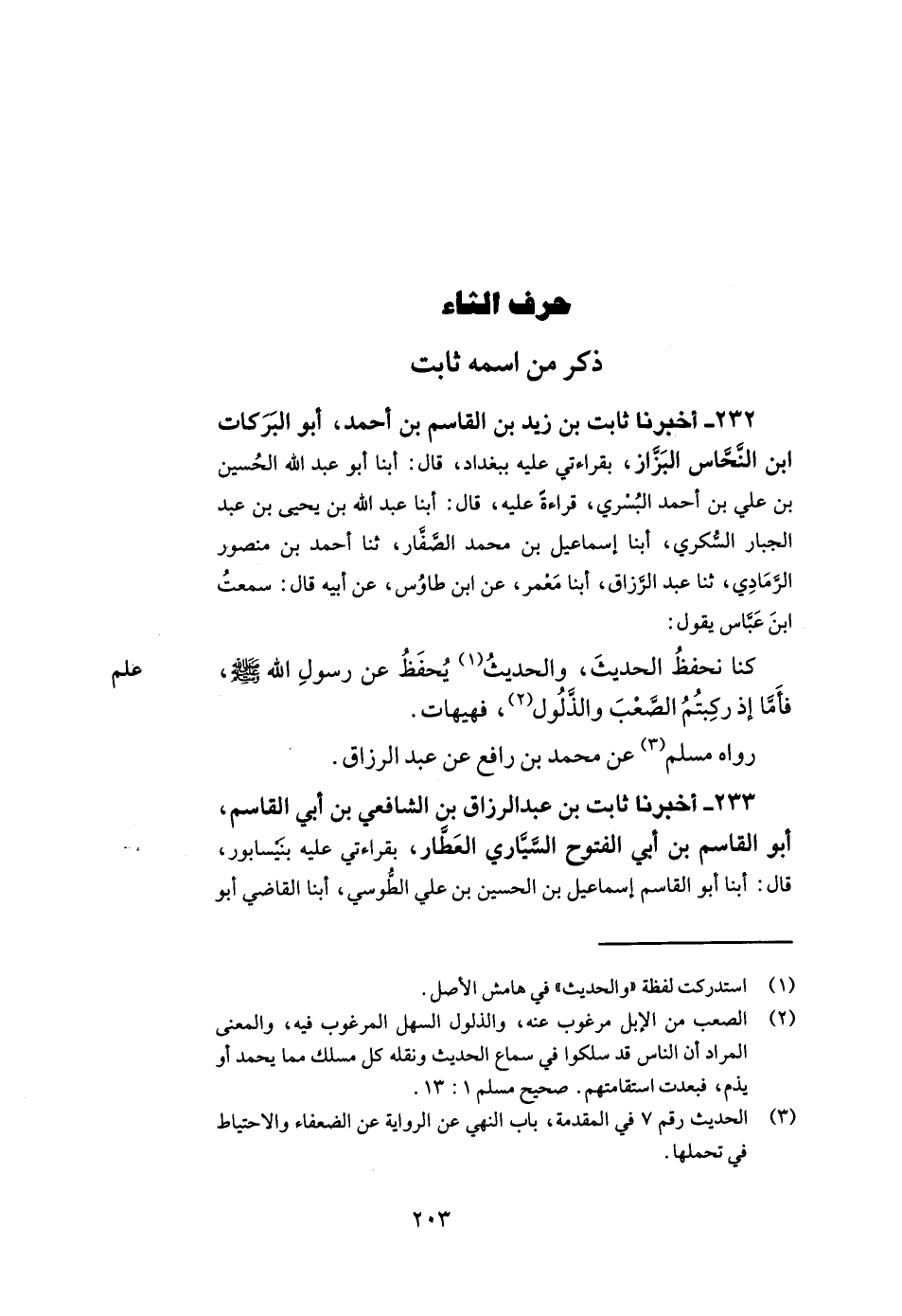 232- أخبرنا ثابت بن زيد بن القاسم بن أحمد أبو البركات بن النحاس البزاز بقراءتي عليه ببغداد قال أبنا أبو عبد الله الحسين بن علي بن أحمد البسري قراءة عليه قال أبنا عبد الله بن يحيى بن عبد الجبار السكري أبنا إسماعيل بن محمد الصفار ثنا أحمد بن منصور الرمادي ثنا عبد الرزاق أبنا معمر عن ابن طاوس عن أبيه قال سمعت ابن عباس يقول كنا نحفظ الحديث والحديث يحفظ عن رسول الله صلى الله عليه وسلم فأما إذ ركبتم الصعب والذلول فهيهات.