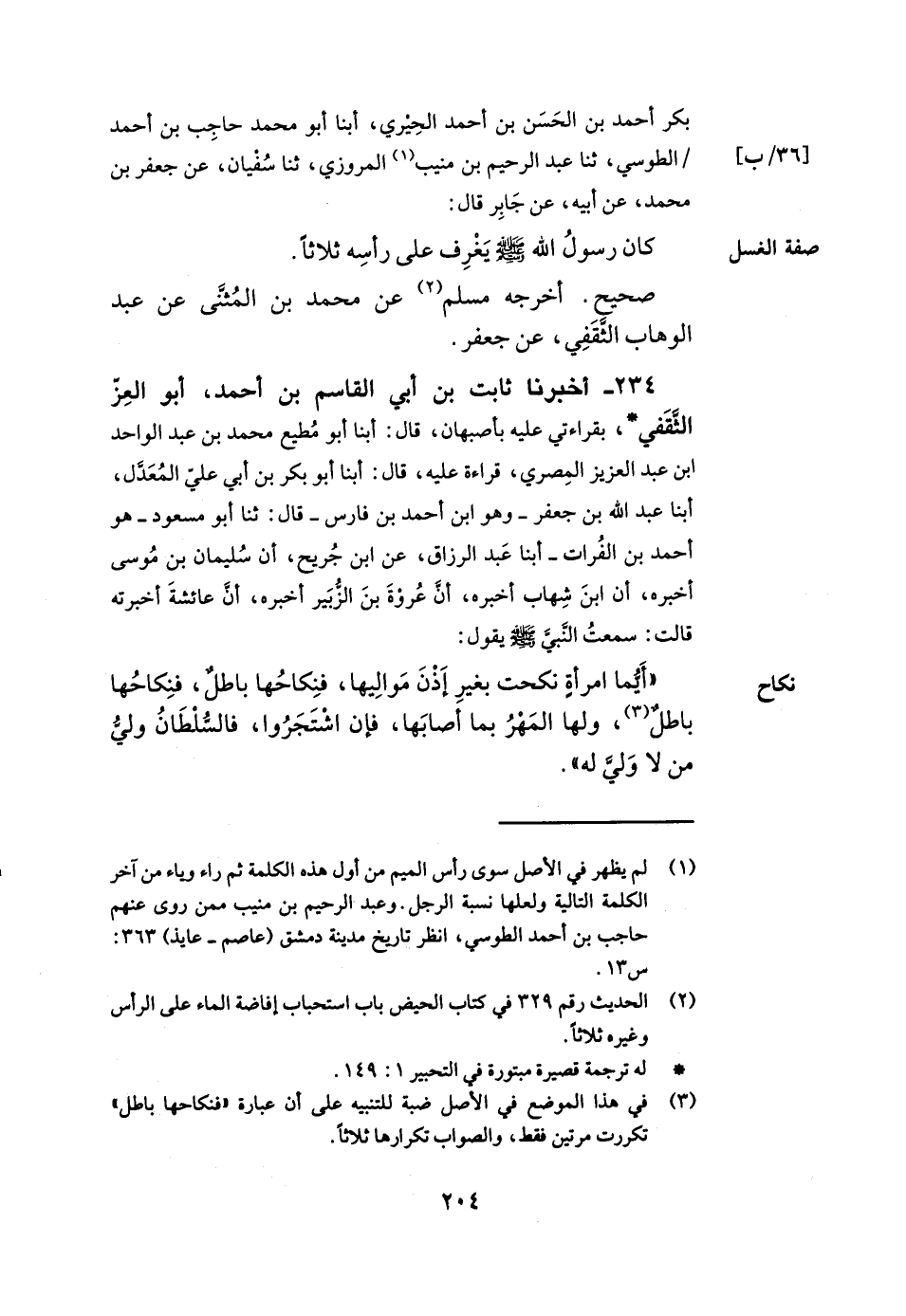 234- أخبرنا ثابت بن أبي القاسم بن أحمد أبو العز الثقفي بقراءتي عليه بأصبهان قال أبنا أبو مطيع محمد بن عبد الواحد بن عبد العزيز المصري قراءة عليه قال أبنا أبو بكر بن أبي علي المعدل أبنا عبد الله بن جعفر وهو ابن أحمد بن فارس قال ثنا أبو مسعود هو أحمد بن الفرات أبنا عبد الرزاق عن ابن جريج أن سليمان بن موسى أخبره أن ابن شهاب أخبره أن عروة بن الزبير أخبره أن عائشة أخبرته قالت سمعت النبي صلى الله عليه وسلم يقول أيما امرأة نكحت بغير إذن مواليها فنكاحها باطل فنكاحها باطل ولها المهر بما أصابها فإن اشتجروا فالسلطان ولي من لا ولي له.