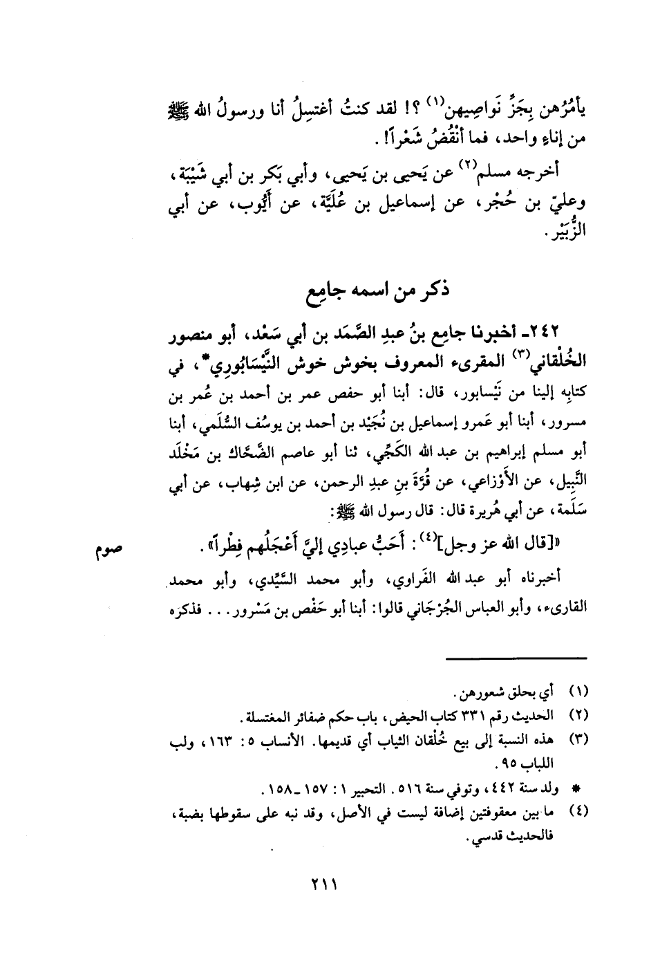 242- أخبرنا جامع بن عبد الصمد بن أبي سعد أبو منصور الخلقاني المقرئ المعروف بخوش خوش النيسابوري في كتابه إلينا من نيسابور قال أبنا أبو حفص عمر بن أحمد بن عمر بن مسرور أبنا أبو عمرو إسماعيل بن نجيد بن أحمد بن يوسف السلمي أبنا أبو مسلم إبراهيم بن عبد الله الكجي ثنا أبو عاصم الضحاك بن مخلد النبيل عن الأوزاعي عن قرة بن عبد الرحمن عن ابن شهاب عن أبي سلمة عن أبي هريرة قال قال رسول الله صلى الله عليه وسلم قال الله عز وجل أحب عبادي إلي أعجلهم فطرا. أخبرناه أبو عبد الله الفراوي وأبو محمد السيدي وأبو محمد القارئ وأبو العباس الجرجاني قالوا أبنا أبو حفص بن مسرور.. .. فذكره -[212]- رواه الترمذي عن عبد الله بن عبد الرحمن الدارمي عن أبي عاصم.