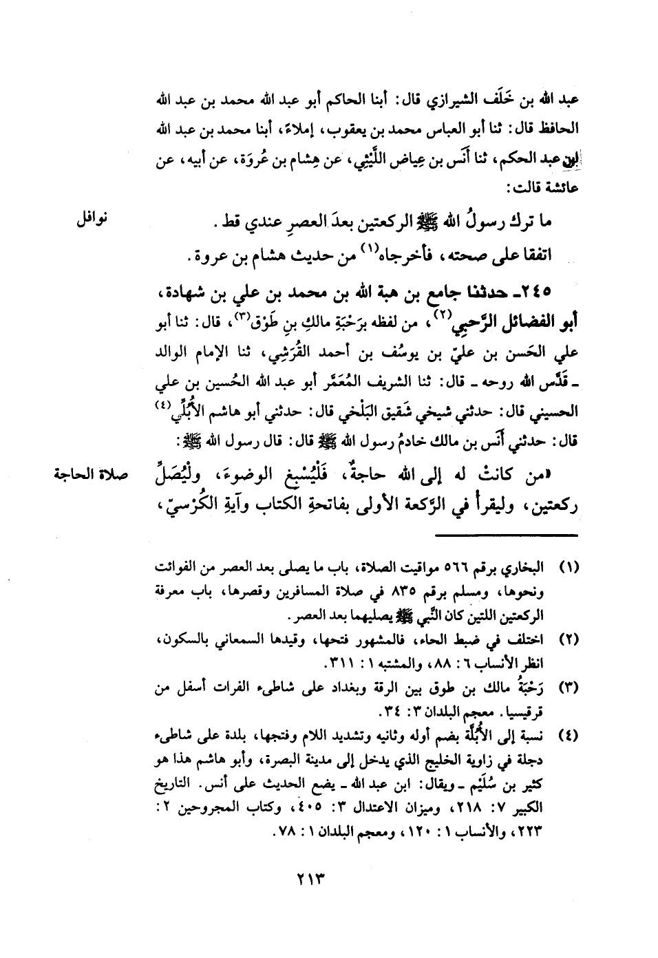 245- حدثنا جامع بن هبة الله بن محمد بن علي بن شهادة أبو الفضائل الرحبي من لفظه برحبة مالك بن طوق قال ثنا أبو علي الحسن بن علي بن يوسف بن أحمد القرشي ثنا الإمام الوالد قدس الله روحه قال ثنا الشريف المعمر أبو عبد الله الحسين بن علي الحسيني قال حدثني شيخي شقيق البلخي قال حدثني أبو هاشم الأبلي قال حدثني أنس بن مالك خادم رسول الله صلى الله عليه وسلم قال قال رسول الله صلى الله عليه وسلم: من كانت له إلى الله حاجة فليسبغ الوضوء وليصل ركعتين وليقرأ في الركعة الأولى بفاتحة الكتاب وآية الكرسي -[214]- وفي الثانية بأم الكتاب و {آمن الرسول} فإذا فرغ من صلاته يدعو بهذا الدعاء وهو يا مؤنس كل وحيد ويا صاحب كل فريد ويا قريب غير بعيد ويا شاهد غير غائب ويا غالب غير مغلوب يا حي يا قيوم يا ذا الجلال والإكرام يا بديع السماوات والأرض اللهم إني أسألك باسمك باسم الله الرحمن الرحيم الحي القيوم الذي لا تأخذه سنة ولا نوم وأسألك باسمك بسم الله الرحمن بالرحيم الحي القيوم الذي عنت له الوجوه وخضعت له الرقاب وخشعت له الأصوات ووجلت له القلوب من خشيته أن تصلي على محمد وعلى آل محمد وأن تجعل لي من أمري فرجا ومن كل هم وغم مخرجا وتفعل بي كذا وكذا. قال لنا أبو الفضائل ذكر الشيخ أن والده أخبره أنه لقي الشريف المعمر فذكر أنه عاش مائتي سنة وستين سنة.