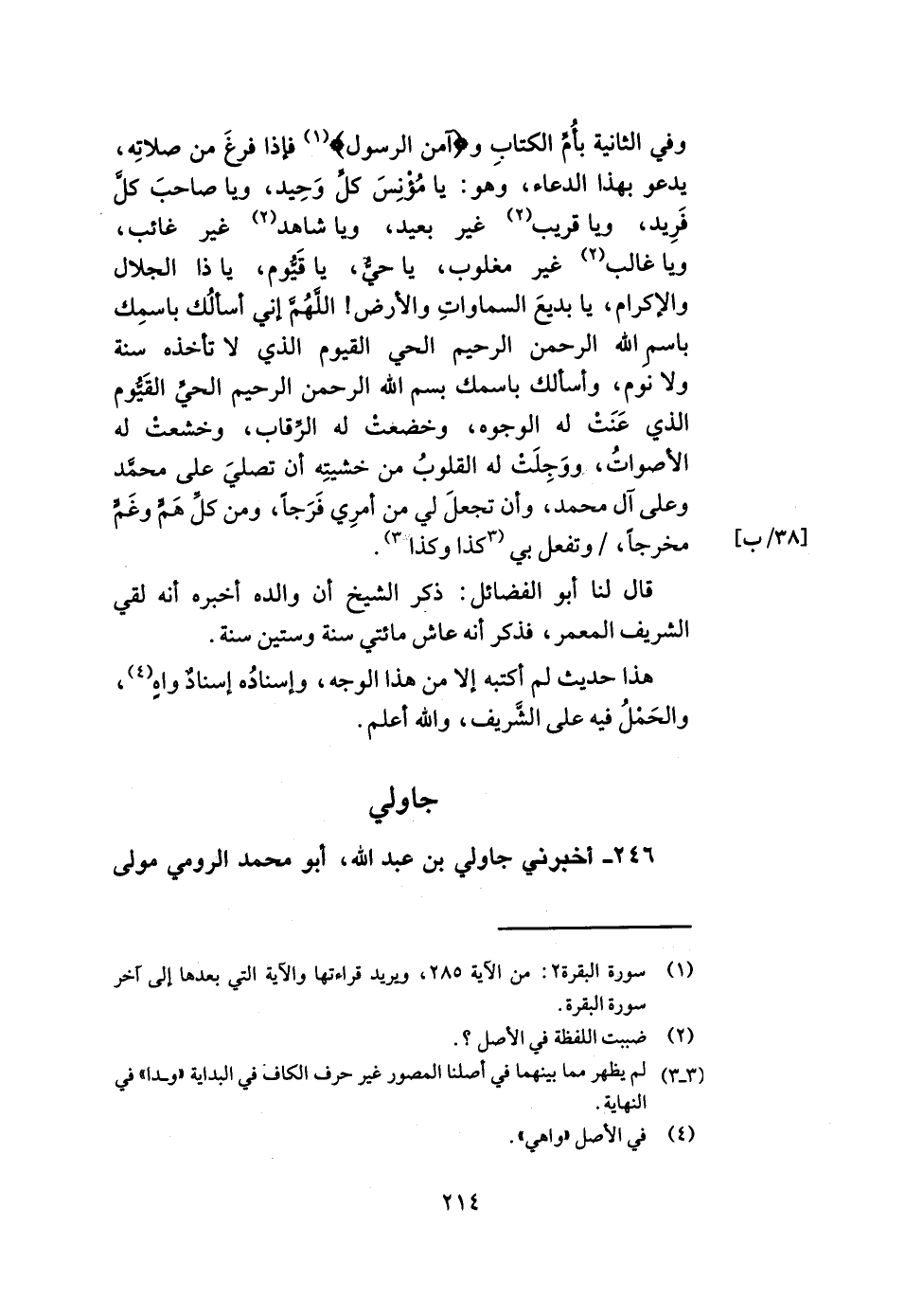 246- أخبرني جاولي بن عبد الله أبو محمد الرومي مولى -[215]- أبي عروبة عبد الهادي بن عبد الله الأنصاري الهروي بقراءتي عليه بهراة قال ثنا أبو سهل نجيب بن ميمون بن علي الواسطي بهراة أبنا أبو علي منصور بن عبد الله بن خالد الذهلي الخالدي قال أبنا عيسى بن محمد بن عيسى البلخي ثنا عيسى بن أحمد العسقلاني ثنا مصعب بن المقدام ثنا سفيان الثوري عن أبي الزبير عن جابر بن عبد الله قال نهى رسول الله صلى الله عليه وسلم أن يمس الرجل ذكره بيمينه وأن يمشي في نعل واحدة وأن يحتبي في ثوب واحد وأن يلتحف الصماء.