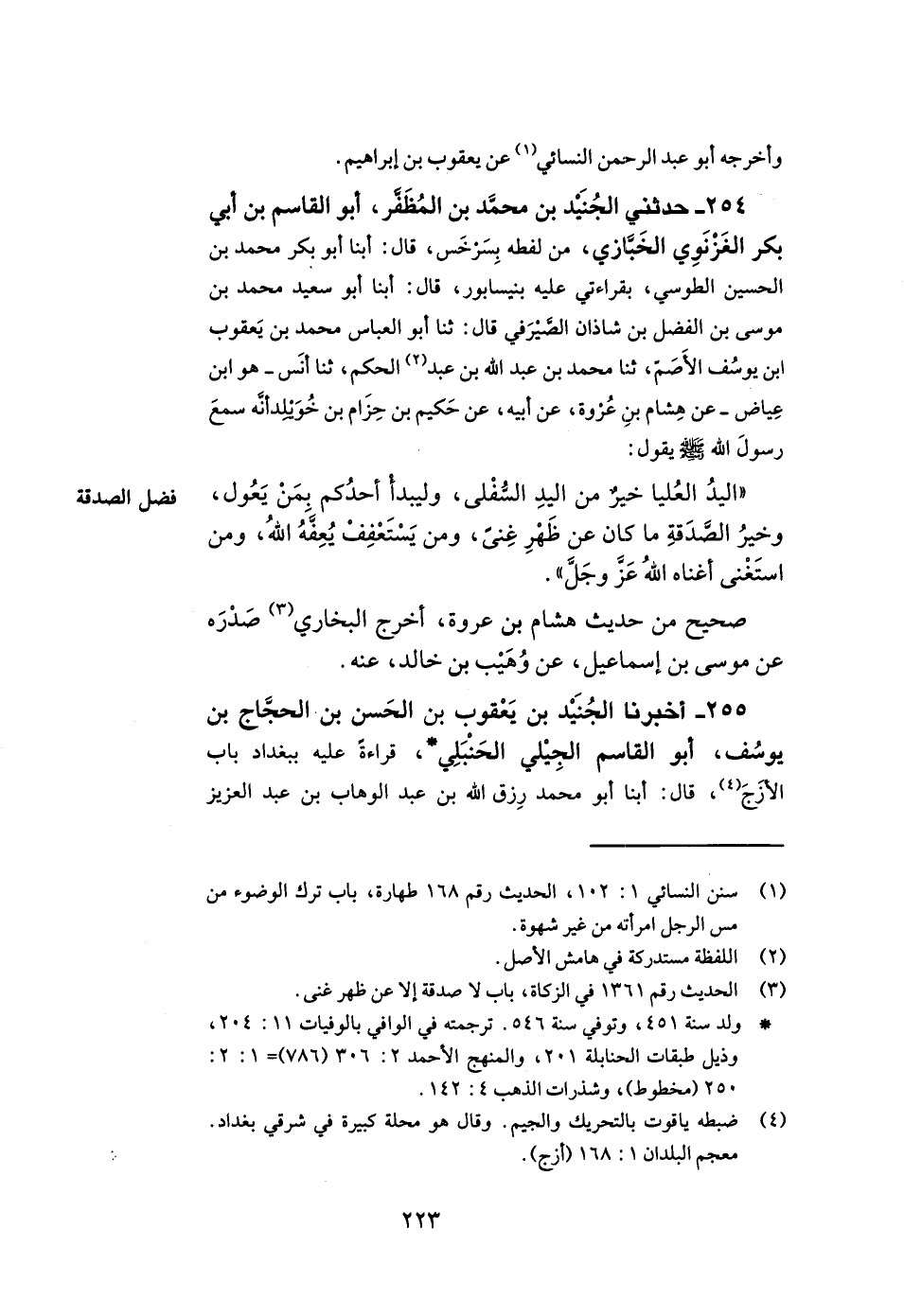 254- حدثني الجنيد بن محمد بن المظفر أبو القاسم بن أبي بكر الغزنوي الخبازي من لفظه بسرخس قال أبنا أبو بكر محمد بن الحسين الطوسي بقراءتي عليه بنيسابور قال أبنا أبو سعيد محمد بن موسى بن الفضل بن شاذان الصيرفي قال ثنا أبو العباس محمد بن يعقوب بن يوسف الأصم ثنا محمد بن عبد الله بن عبد الحكم ثنا أنس هو ابن عياض عن هشام بن عروة عن أبيه عن حكيم بن حزام بن خويلد أنه سمع رسول الله صلى الله عليه وسلم يقول اليد العليا خير من اليد السفلى وليبدأ أحدكم بمن يعول وخير الصدقة ما كان عن ظهر غنى ومن يستعفف يعفه الله ومن استغنى أغناه الله عز وجل.
