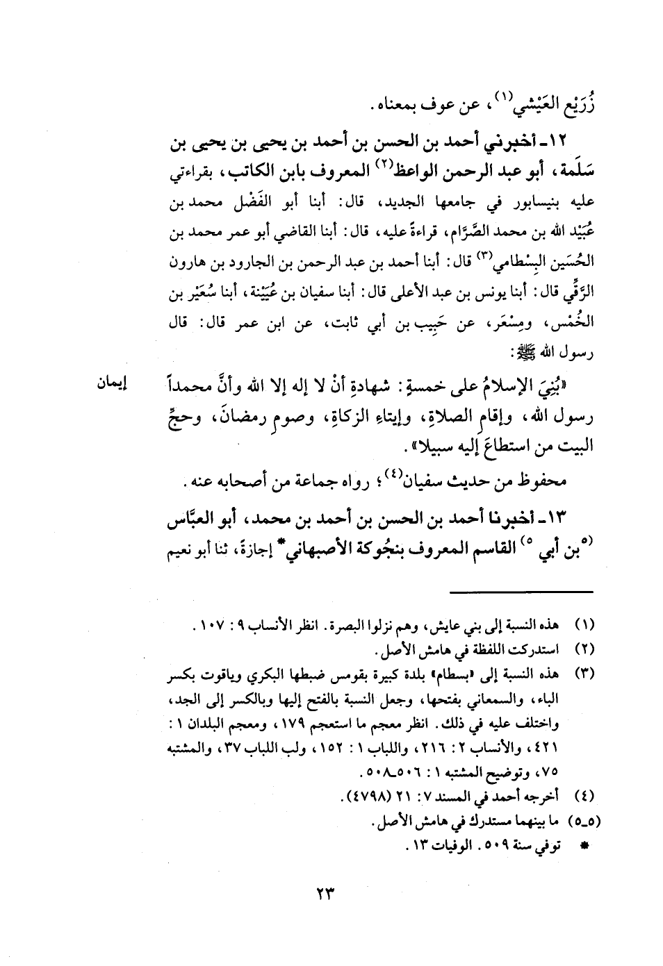 12- أخبرني أحمد بن الحسن بن أحمد بن يحيى بن يحيى بن سلمة أبو عبد الرحمن الواعظ المعروف بابن الكاتب بقراءتي عليه بنيسابور في جامعها الجديد قال أبنا أبو الفضل محمد بن عبيد الله بن محمد الصرام قراءة عليه قال أبنا القاضي أبو عمر محمد بن الحسين البسطامي قال أبنا أحمد بن عبد الرحمن بن الجارود بن هارون الرقي قال أبنا يونس بن عبد الأعلى قال أبنا سفيان بن عيينة أبنا سعير بن الخمس ومسعر عن حبيب بن أبي ثابت عن ابن عمر قال قال رسول الله صلى الله عليه وسلم بني الإسلام على خمسة شهادة أن لا إله إلا الله وأن محمدا رسول الله وإقام الصلاة وإيتاء الزكاة وصوم رمضان وحج البيت من استطاع إليه سبيلا.