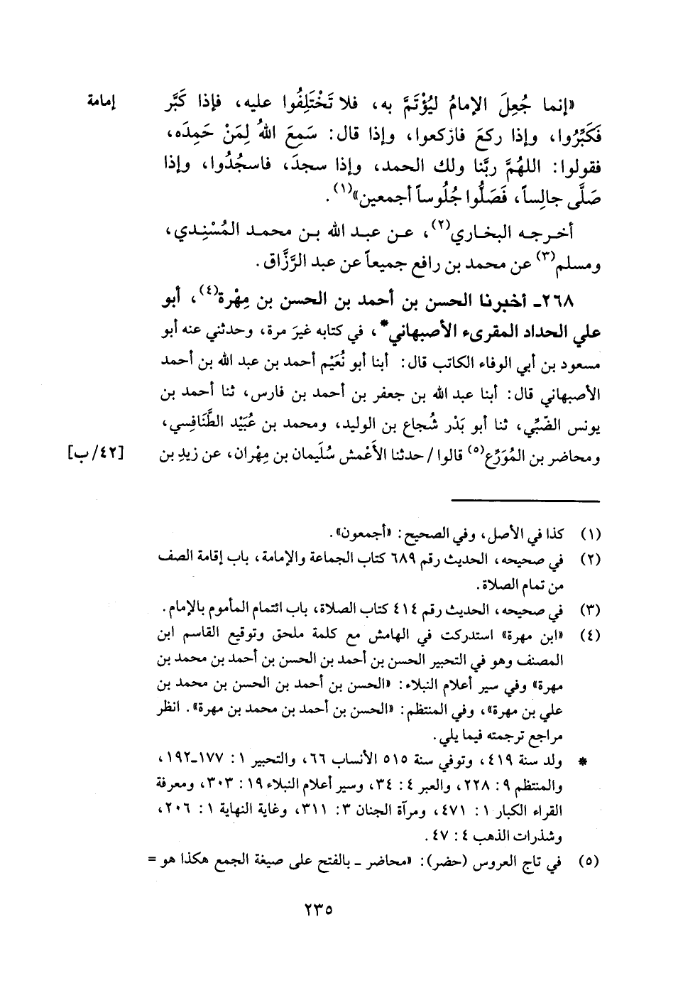 268- أخبرنا الحسن بن أحمد بن الحسن بن مهرة أبو علي الحداد المقرئ الأصبهاني في كتابه غير مرة وحدثني عنه أبو مسعود بن أبي الوفاء الكاتب قال أبنا أبو نعيم أحمد بن عبد الله بن أحمد الأصبهاني قال أبنا عبد الله بن جعفر بن أحمد بن فارس ثنا أحمد بن يونس الضبي ثنا أبو بدر شجاع بن الوليد ومحمد بن عبيد الطنافسي ومحاضر بن المورع قالوا حدثنا الأعمش سليمان بن مهران عن زيد بن -[236]- وهب الجهني عن عبد الله بن مسعود قال حدثنا رسول الله صلى الله عليه وسلم وهو الصادق المصدوق أن خلق أحدكم يجمع في بطن أمه أربعين يوما وقال محاضر أربعين ليلة ثم يكون علقة مثل ذلك ثم يكون مضغة مثل ذلك ثم يبعث الله إليه ملكا فيؤمر بأربع كلمات يقال له اكتب رزقه وعلمه وأجله وشقي أم سعيد زاد أبو بدر في حديثه ثم ينفخ فيه الروح فإن أحدكم ليعمل بعمل أهل الجنة حتى ما يكون بينه وبينها إلا ذراع فيختم له بعمل أهل النار فيدخلها وإن أحدكم ليعمل بعمل أهل النار حتى ما يكون بينه وبينها غير ذراع فيختم له بعمل أهل الجنة فيدخلها.