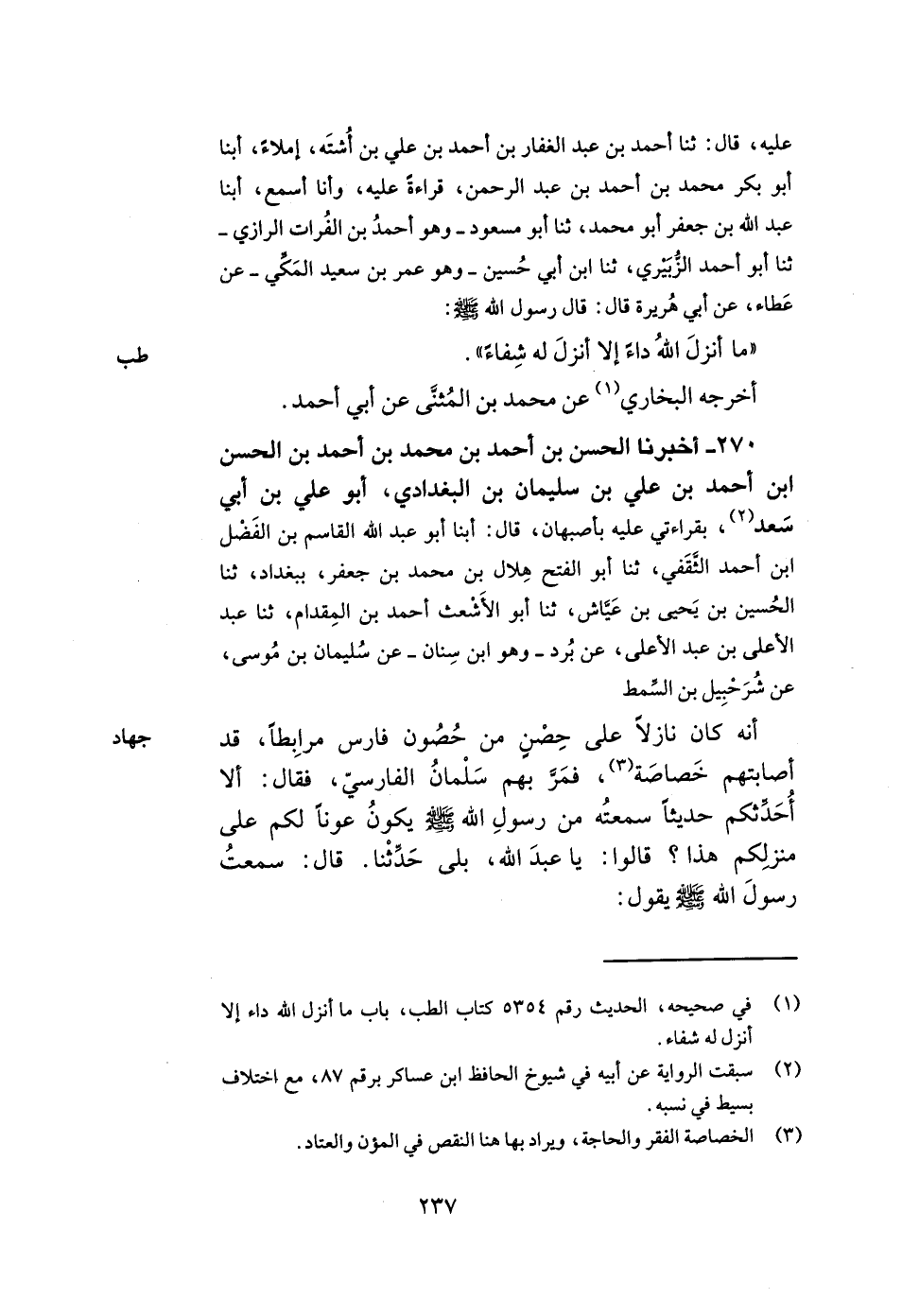 270- أخبرنا الحسن بن أحمد بن محمد بن أحمد بن الحسن بن أحمد بن علي بن سليمان بن البغدادي أبو علي بن أبي سعد بقراءتي عليه بأصبهان قال أبنا أبو عبد الله القاسم بن الفضل بن أحمد الثقفي ثنا أبو الفتح هلال بن محمد بن جعفر ببغداد ثنا الحسين بن يحيى بن عياش ثنا أبو الأشعث أحمد بن المقدام ثنا عبد الأعلى بن عبد الأعلى عن برد وهو ابن سنان عن سليمان بن موسى عن شرحبيل بن السمط أنه كان نازلا على حصن من حصون فارس مرابطا قد أصابتهم خصاصة فمر بهم سلمان الفارسي فقال ألا أحدثكم حديثا سمعته من رسول الله صلى الله عليه وسلم يكون عونا لكم على منزلكم هذا قالوا يا عبد الله بلى حدثنا قال سمعت رسول الله صلى الله عليه وسلم يقول -[238]- رباط يوم في سبيل الله خير من صيام شهر وقيامه ومن مات مرابطا في سبيل الله كان له أجر مجاهد يوم القيامة.
