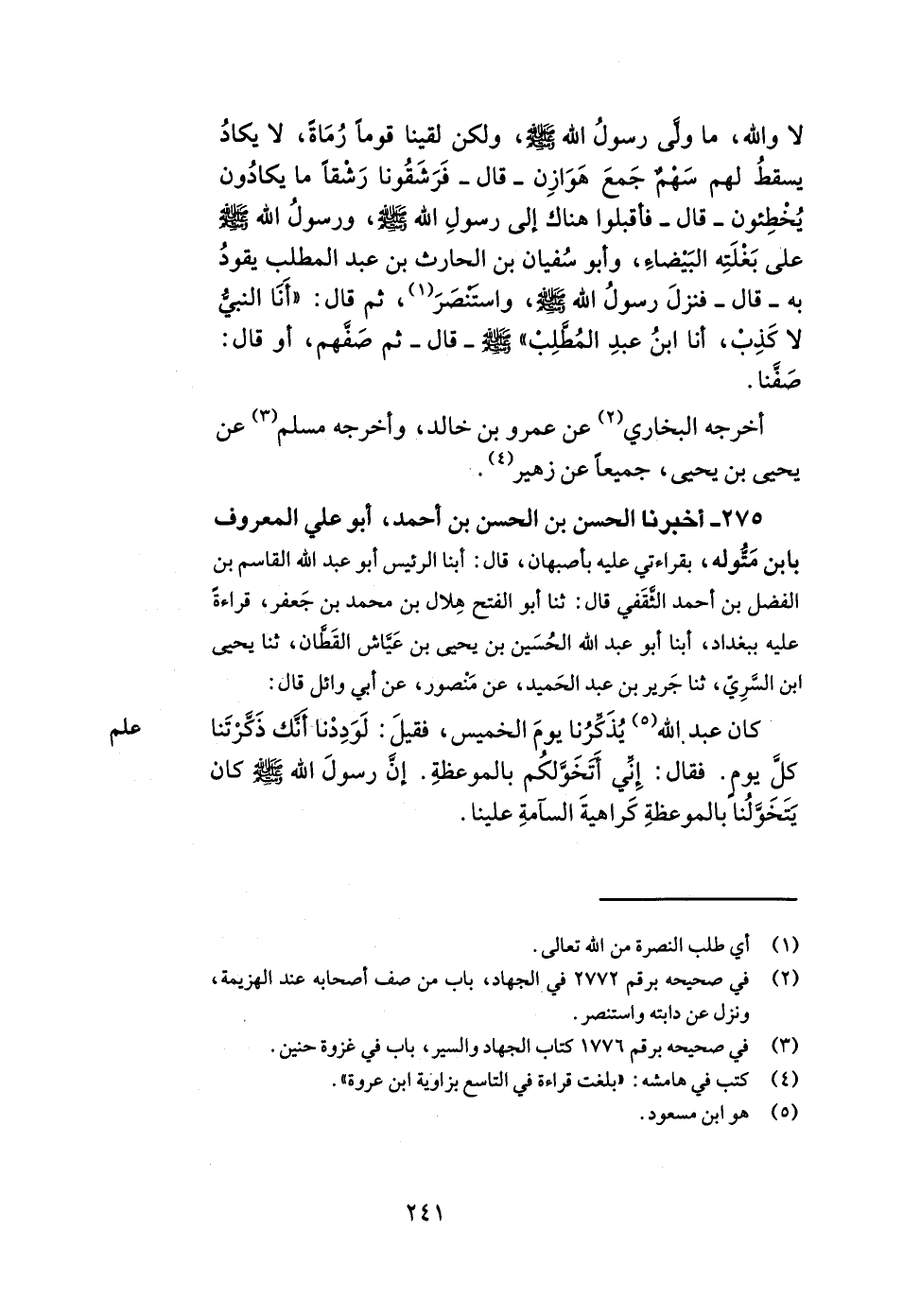 275- أخبرنا الحسن بن الحسن بن أحمد أبو علي المعروف بابن متوله بقراءتي عليه بأصبهان قال أبنا الرئيس أبو عبد الله القاسم بن الفضل بن أحمد الثقفي قال ثنا أبو الفتح هلال بن محمد بن جعفر قراءة عليه ببغداد أبنا أبو عبد الله الحسين بن يحيى بن عياش القطان ثنا يحيى بن السري ثنا جرير بن عبد الحميد عن منصور عن أبي وائل قال كان عبد الله يذكرنا يوم الخميس فقيل لوددنا أنك ذكرتنا كل يوم فقال إني أتخولكم بالموعظة إن رسول الله صلى الله عليه وسلم كان يتخولنا بالموعظة كراهية السآمة علينا.