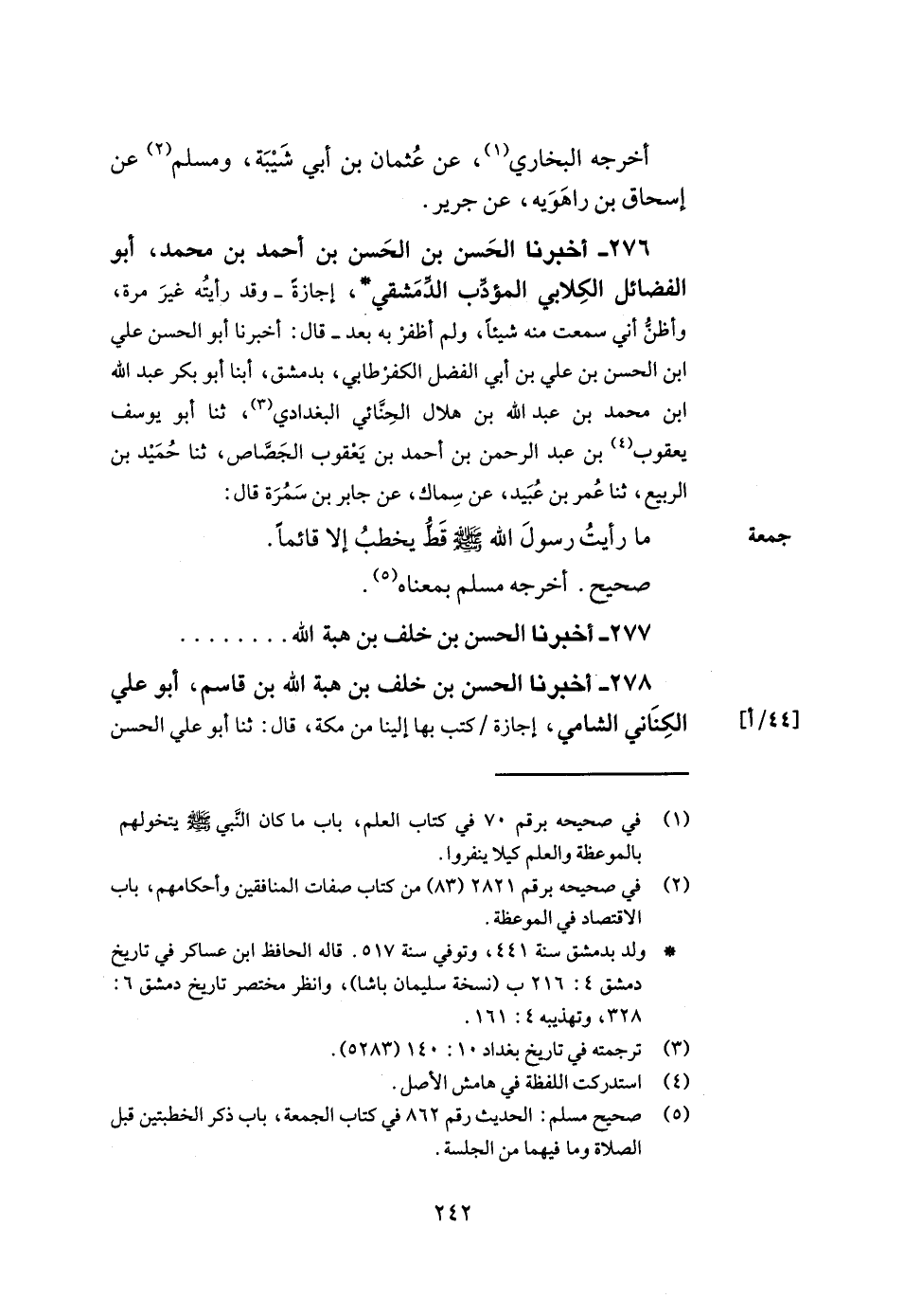 276- أخبرنا الحسن بن الحسن بن أحمد بن محمد أبو الفضائل الكلابي المؤدب الدمشقي إجازة وقد رأيته غير مرة وأظن أني سمعت منه شيئا ولم أظفر به بعد قال أخبرنا أبو الحسن علي بن الحسن بن علي بن أبي الفضل الكفرطابي بدمشق أبنا أبو بكر عبد الله بن محمد بن عبد الله بن هلال الحنائي البغدادي ثنا أبو يوسف يعقوب بن عبد الرحمن بن أحمد بن يعقوب الجصاص ثنا حميد بن الربيع ثنا عمر بن عبيد عن سماك عن جابر بن سمرة قال ما رأيت رسول الله صلى الله عليه وسلم قط يخطب إلا قائما.