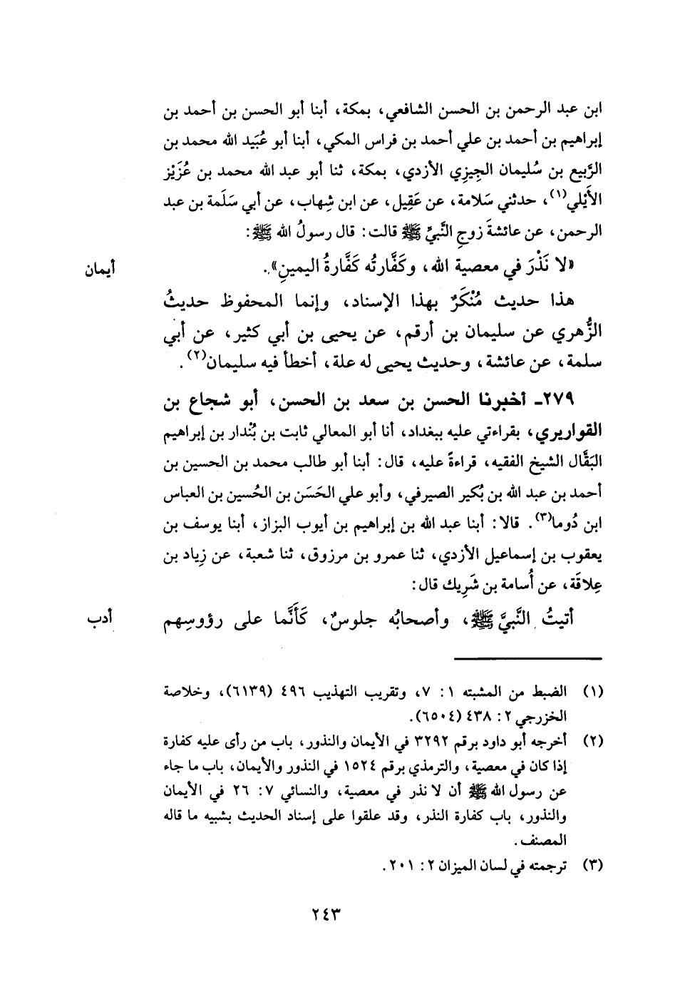 279- أخبرنا الحسن بن سعد بن الحسن أبو شجاع بن القواريري بقراءتي عليه ببغداد أنا أبو المعالي ثابت بن بندار بن إبراهيم البقال الشيخ الفقيه قراءة عليه قال أبنا أبو طالب محمد بن الحسين بن أحمد بن عبد الله بن بكير الصيرفي وأبو علي الحسن بن الحسين بن العباس بن دوما قالا أبنا عبد الله بن إبراهيم بن أيوب البزاز أبنا يوسف بن يعقوب بن إسماعيل الأزدي ثنا عمرو بن مرزوق ثنا شعبة عن زياد بن علاقة عن أسامة بن شريك قال أتيت النبي صلى الله عليه وسلم وأصحابه جلوس كأنما على رؤوسهم -[244]- الطير فسألوه قالوا يا رسول الله ما خير ما أعطي الناس قال خلق حسن.