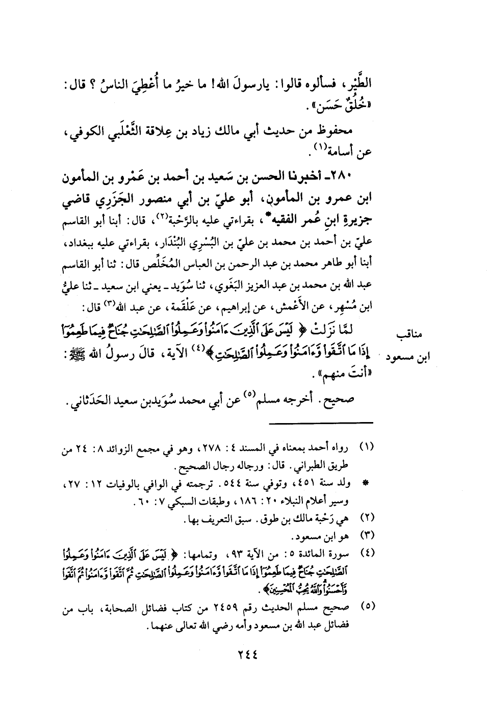 280- أخبرنا الحسن بن سعيد بن أحمد بن عمرو بن المأمون بن عمرو بن المأمون أبو علي بن أبي منصور الجزري قاضي جزيرة ابن عمر الفقيه بقراءتي عليه بالرحبة قال أبنا أبو القاسم علي بن أحمد بن محمد بن علي بن البسري البندار بقراءتي عليه ببغداد أبنا أبو طاهر محمد بن عبد الرحمن بن العباس المخلص قال ثنا أبو القاسم عبد الله بن محمد بن عبد العزيز البغوي ثنا سويد يعني بن سعيد ثنا علي بن مسهر عن الأعمش عن إبراهيم عن علقمة عن عبد الله قال لما نزلت: {ليس على الذين آمنوا وعملوا الصالحات جناح فيما طعموا إذا ما اتقوا وآمنوا وعملوا الصالحات} الآية قال رسول الله صلى الله عليه وسلم أنت منهم.