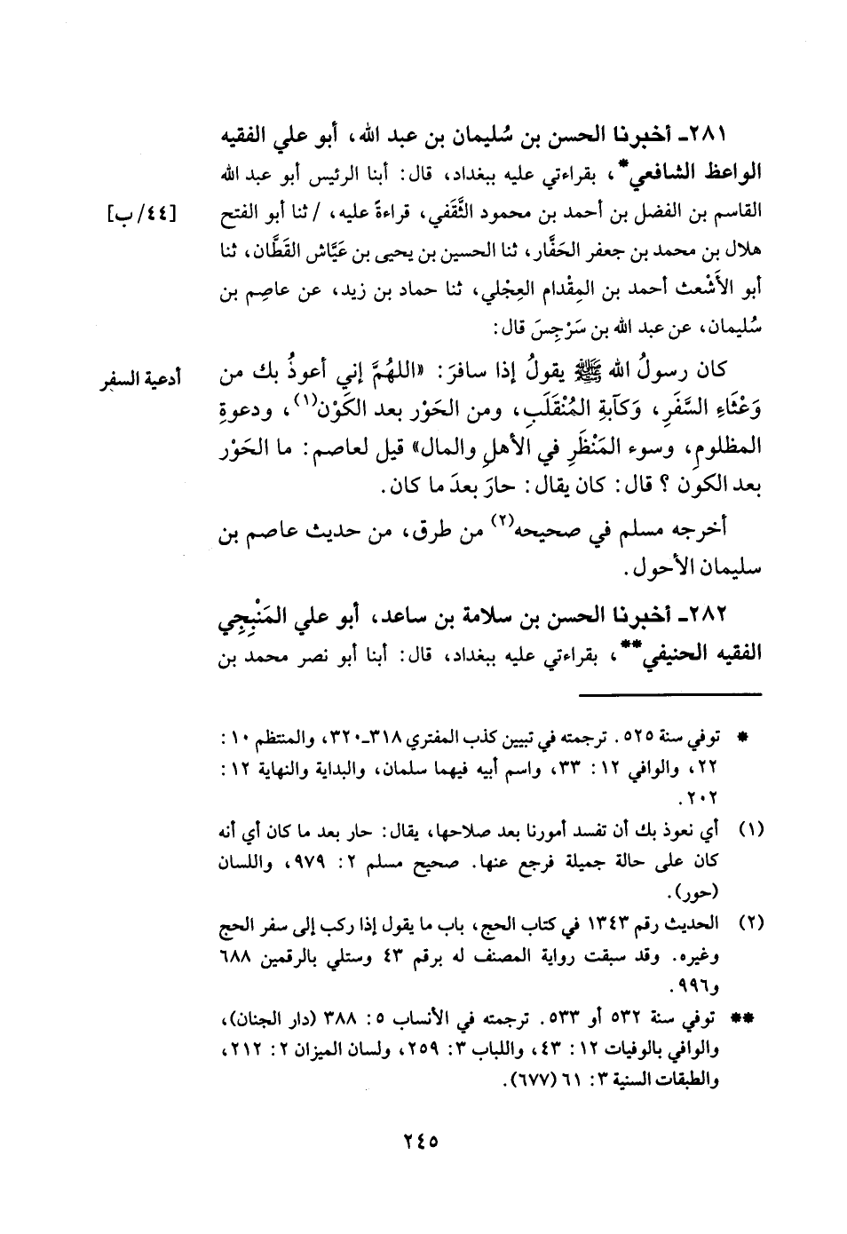 281- أخبرنا الحسن بن سليمان بن عبد الله أبو علي الفقيه الواعظ الشافعي بقراءتي عليه ببغداد قال أبنا الرئيس أبو عبد الله القاسم بن الفضل بن أحمد بن محمود الثقفي قراءة عليه ثنا أبو الفتح هلال بن محمد بن جعفر الحفار ثنا الحسين بن يحيى بن عياش القطان ثنا أبو الأشعث أحمد بن المقدام العجلي ثنا حماد بن زيد عن عاصم بن سليمان عن عبد الله بن سرجس قال كان رسول الله صلى الله عليه وسلم يقول إذا سافر اللهم إني أعوذ بك من وعثاء السفر وكآبة المنقلب ومن الحور بعد الكون ودعوة المظلوم وسوء المنظر في الأهل والمال قيل لعاصم ما الحور بعد الكون قال كان يقال حار بعد ما كان. أخرجه مسلم في صحيحه من طرق من حديث عاصم بن سليمان الأحول.
