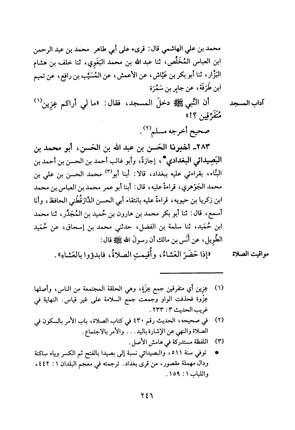 283- أخبرنا الحسن بن عبد الله بن الحسن أبو محمد بن البصيدائي البغدادي إجازة وأبو غالب أحمد بن الحسن بن أحمد بن البناء بقراءتي عليه ببغداد قالا أبنا أبو محمد الحسن بن علي بن محمد الجوهري قراءة عليه قال أبنا أبو عمر محمد بن العباس بن محمد بن زكريا بن حيويه قراءة عليه بانتقاء أبي الحسن الدارقطني الحافظ وأنا أسمع قال ثنا أبو بكر محمد بن هارون بن حميد بن المجدر ثنا محمد بن حميد ثنا سلمة بن الفضل حدثني محمد بن إسحاق عن حميد الطويل عن أنس بن مالك أن رسول الله صلى الله عليه وسلم قال إذا حضر العشاء وأقيمت الصلاة فابدؤوا بالعشاء.