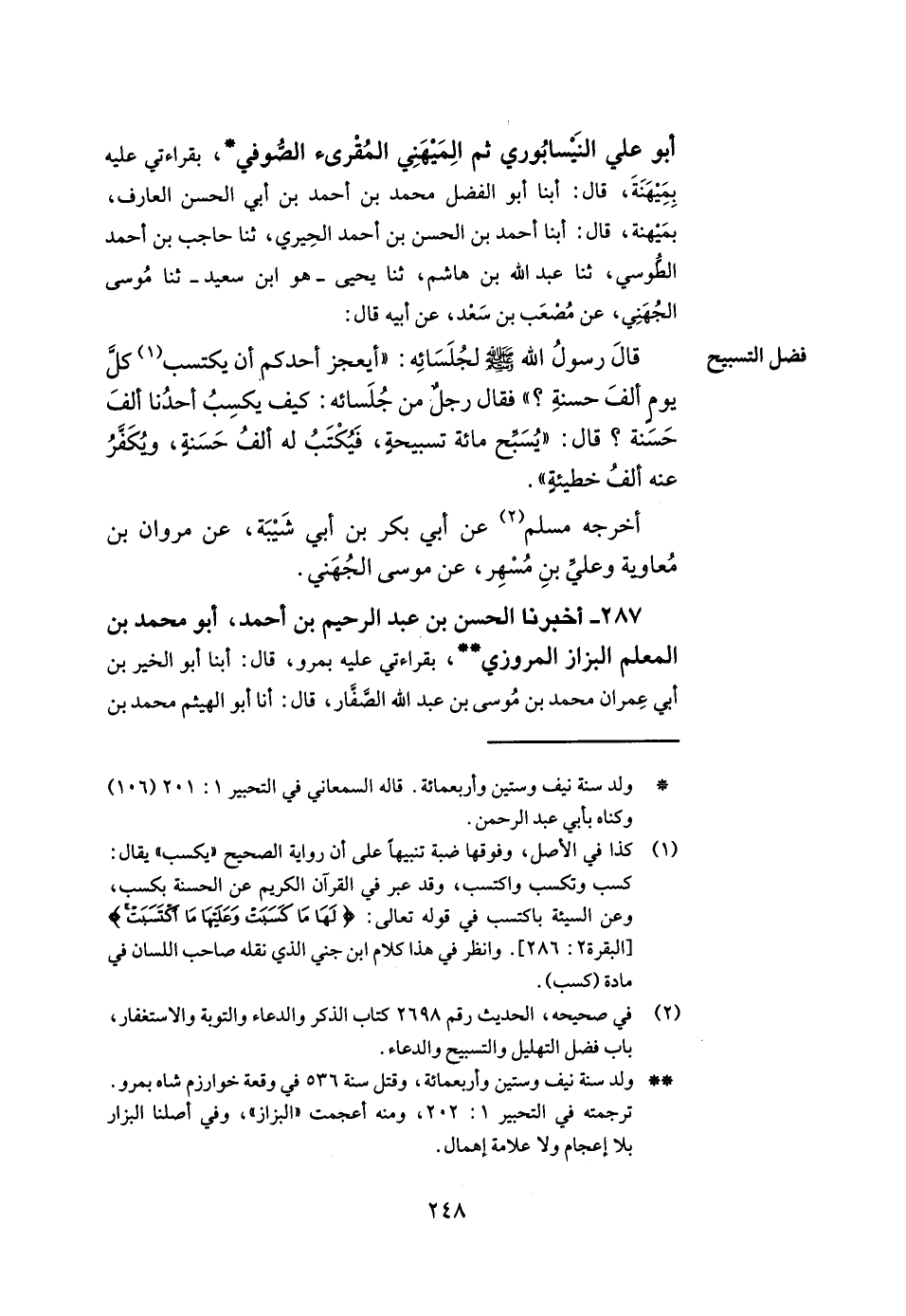 287- أخبرنا الحسن بن عبد الرحيم بن أحمد أبو محمد بن المعلم البزاز المروزي بقراءتي عليه بمرو قال أبنا أبو الخير بن أبي عمران محمد بن موسى بن عبد الله الصفار قال أنا أبو الهيثم محمد بن -[249]- المكي بن محمد بن المكي الكشميهني ثنا أبو عبد الله محمد بن يوسف بن بشر بن مطر بن صالح الفربري بها ثنا أبو عبد الله محمد بن إسماعيل بن إبراهيم البخاري رحمه الله قال ثنا مكي بن إبراهيم ثنا يزيد بن أبي عبيد عن سلمة وهو ابن الأكوع قال سمعت النبي صلى الله عليه وسلم يقول من يقل علي ما لم أقل فليتبوأ مقعده من النار.