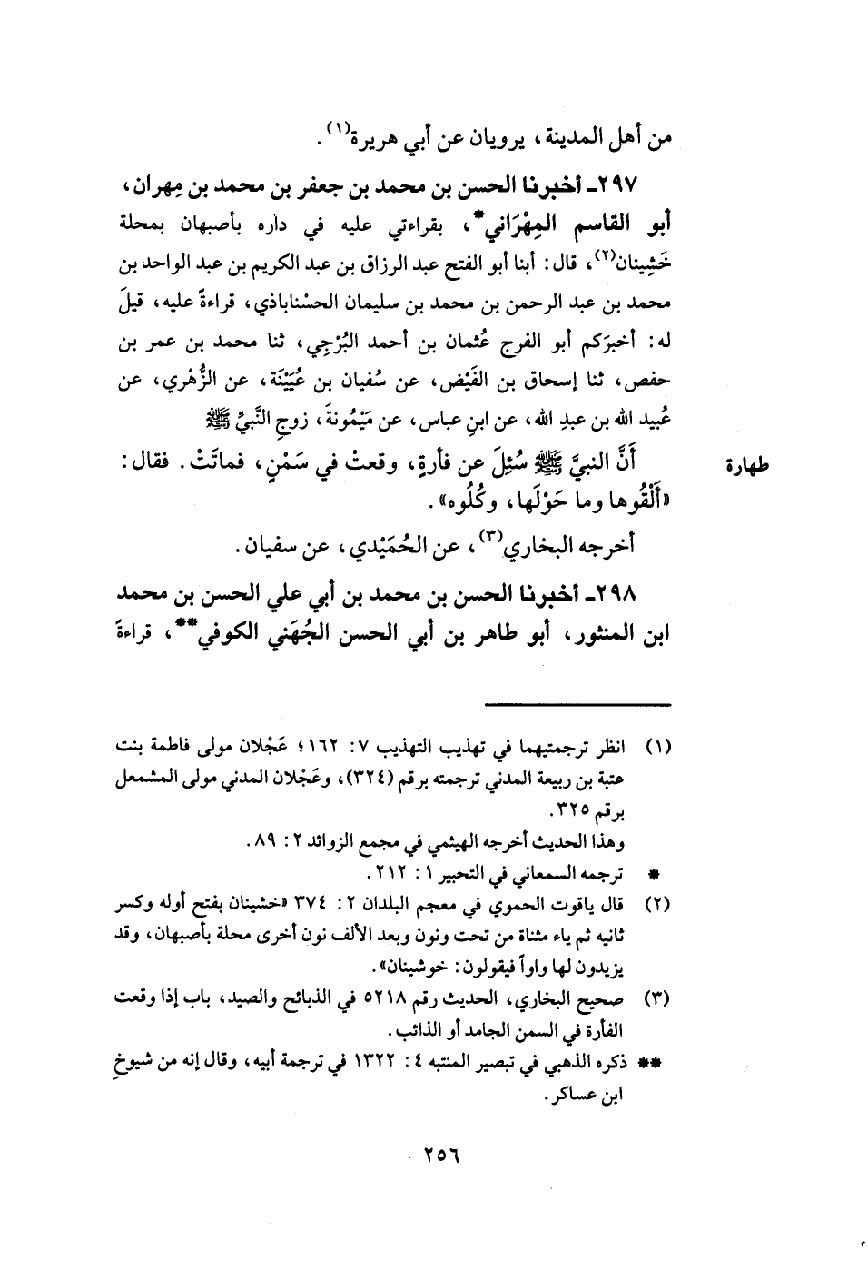 297- أخبرنا الحسن بن محمد بن جعفر بن محمد بن مهران أبو القاسم المهراني بقراءتي عليه في داره بأصبهان بمحلة خشينان قال أبنا أبو الفتح عبد الرزاق بن عبد الكريم بن عبد الوحد بن محمد بن عبد الرحمن بن محمد بن سليمان الحسناباذي قراءة عليه قيل له أخبركم أبو الفرج عثمان بن أحمد البرجي ثنا محمد بن عمر بن حفص ثنا إسحاق بن الفيض عن سفيان بن عيينة عن الزهري عن عبيد الله بن عبد الله عن ابن عباس عن ميمونة زوج النبي صلى الله عليه وسلم أن النبي صلى الله عليه وسلم سئل عن فأرة وقعت في سمن فماتت فقال ألقوها وما حولها وكلوه.