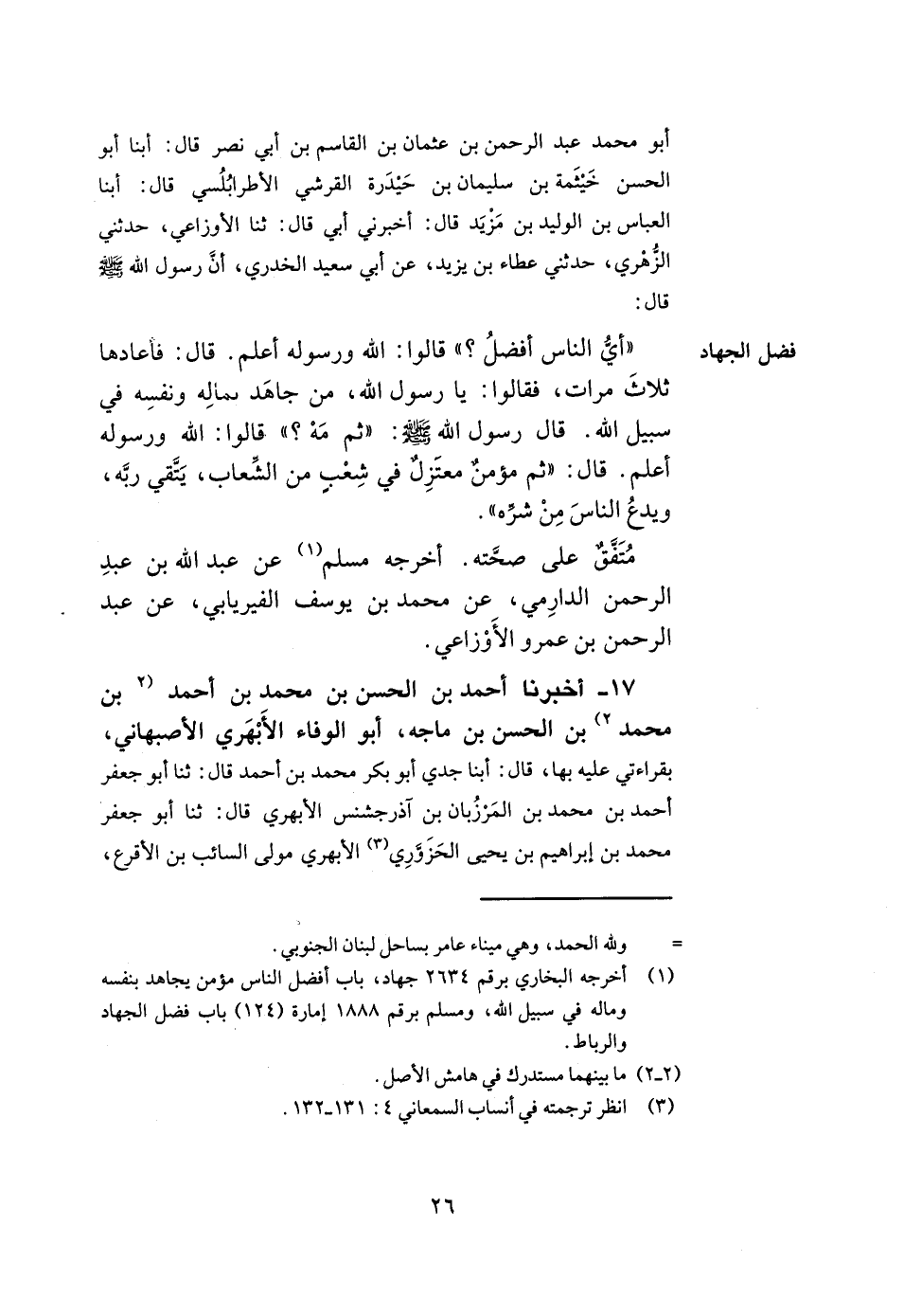 17- أخبرنا أحمد بن الحسن بن محمد بن أحمد بن محمد بن الحسن بن ماجه أبو الوفاء الأبهري الأصبهاني بقراءتي عليه بها قال أبنا جدي أبو بكر محمد بن أحمد قال ثنا أبو جعفر أحمد بن محمد بن المرزبان بن آذرجشنس الأبهري قال ثنا أبو جعفر محمد بن إبراهيم بن يحيى الحزوري الأبهري مولى السائب بن الأقرع -[27]- ثنا أبو جعفر محمد بن سليمان بن حبيب لوين المصيصي قال ثنا حماد بن زياد عن المعلى بن زيد عن الحسن عن الأسود بن سريع قال بعث رسول الله صلى الله عليه وسلم سرية جيشا فأسرعوا في القتل حتى أصابوا الولدان قال رسول الله صلى الله عليه وسلم ألم أنهكم قالوا إنما هم أولاد المشركين يا رسول الله قال أو ليس خياركم أولاد المشركين ثم أمر مناديه فنادى ألا إن كل مولود يولد على الفطرة.