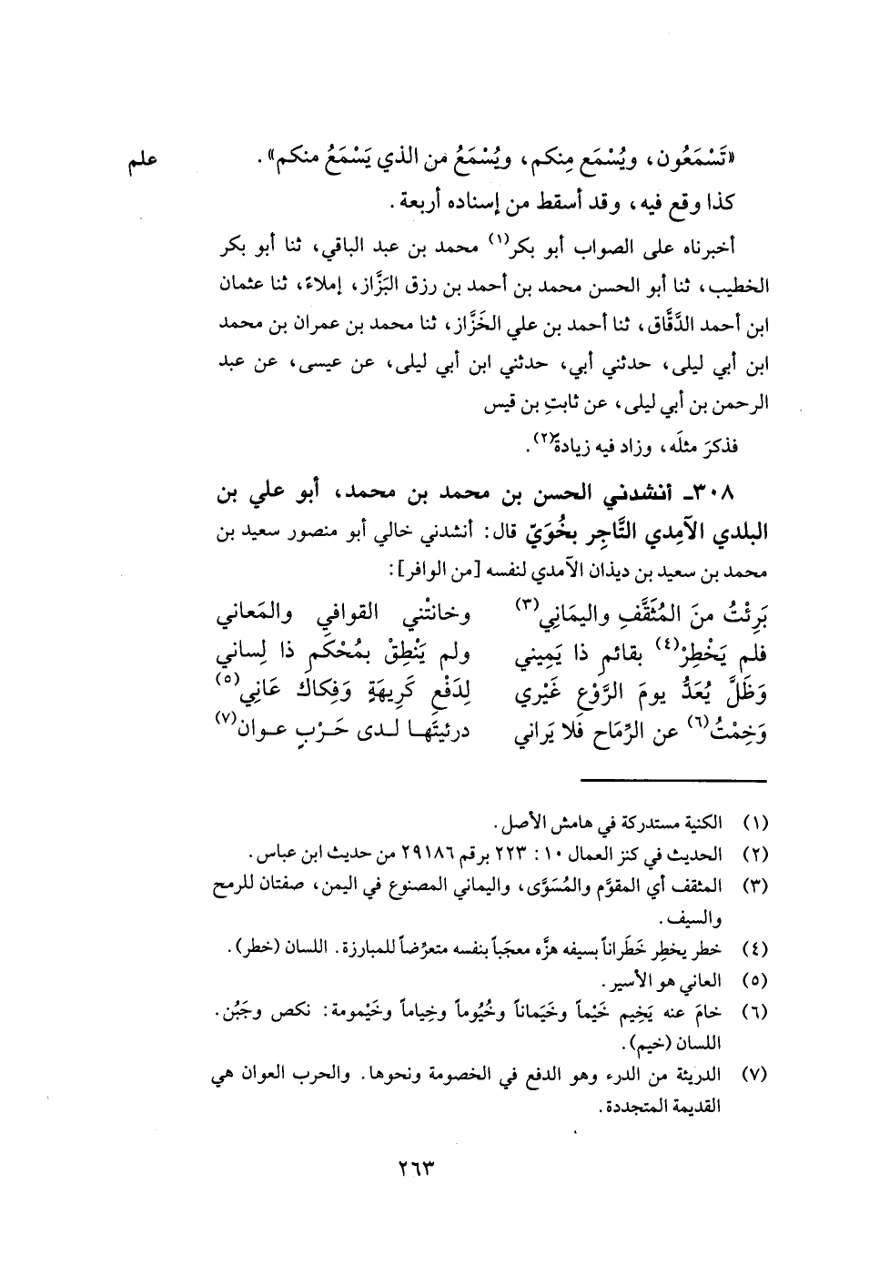 308- أنشدني الحسن بن محمد بن محمد أبو علي بن البلدي الآمدي التاجر بخوي قال أنشدني خالي أبو منصور سعيد بن محمد بن سعيد بن ديذان الآمدي لنفسه