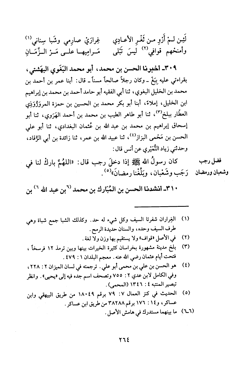 309- أخبرنا الحسن بن محمد أبو محمد البغوي البهشتي بقراءتي عليه ببغ وكان رجلا صالحا مسنا قال أبنا عمر بن أحمد بن محمد بن الخليل البغوي ثنا أبي الفقيه أبو حامد أحمد بن محمد بن إبراهيم بن الخليل إملاء أبنا أبو بكر محمد بن الحسين بن حمزة المروروذي العطار ببلخ ثنا أبو طاهر الطيب بن محمد بن أحمد الهروي ثنا أبو إسحاق إبراهيم بن محمد بن عبد الله بن عثمان البغدادي ثنا أبو علي الحسن بن محمى البزاز ثنا عبيد الله بن عمر ثنا زائدة بن أبي الرقاد وحدثني زياد النميري عن أنس قال كان رسول الله صلى الله عليه وسلم إذا دخل رجب قال اللهم بارك لنا في رجب وشعبان وبلغنا رمضان.