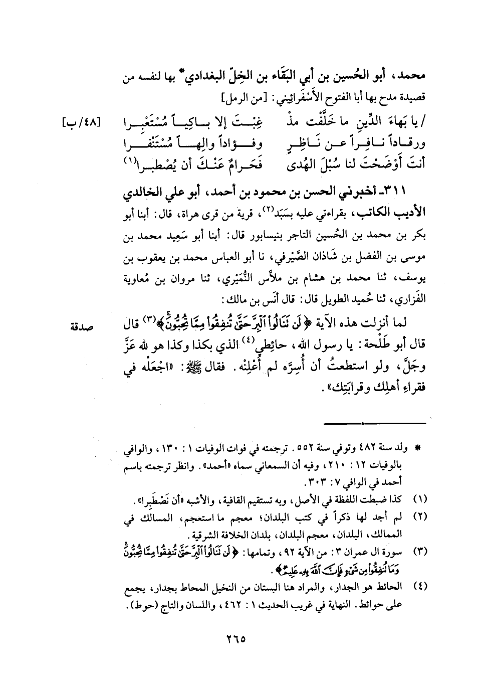 311- أخبرني الحسن بن محمود بن أحمد أبو علي الخالدي الأديب الكاتب بقراءتي عليه بسبد قرية من قرى هراة قال أبنا أبو بكر بن محمد بن الحسين التاجر بنيسابور قال أبنا أبو سعيد محمد بن موسى بن الفضل بن شاذان الصيرفي نا أبو العباس محمد بن يعقوب بن يوسف ثنا محمد بن هشام بن ملاس النميري ثنا مروان بن معاوية الفزاري ثنا حميد الطويل قال قال أنس بن مالك لما أنزلت هذه الآية: {لن تنالوا البر حتى تنفقوا مما تحبون} . قال قال أبو طلحة يا رسول الله حائطي الذي بكذا وكذا هو لله عز وجل ولو استطعت أن أسره لم أعلنه فقال صلى الله عليه وسلم اجعله في فقراء أهلك وقرابتك.