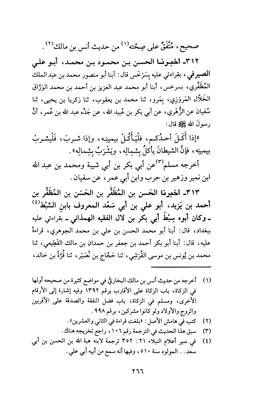 312- أخبرنا الحسن بن محمود بن محمد أبو علي الصيرفي بقراءتي عليه بسرخس قال أبنا أبو منصور محمد بن عبد الملك المظفري بسرخس أبنا أبو محمد عبد العزيز بن أحمد بن محمد الوراق الخلال المروزي بمرو ثنا محمد بن يعقوب ثنا زكريا بن يحيى ثنا سفيان عن الزهري عن أبي بكر بن عبيد الله عن جده عبد الله بن عمر أن رسول الله صلى الله عليه وسلم قال إذا أكل أحدكم فليأكل بيمينه وإذا شرب فليشرب بيمينه فإن الشيطان يأكل بشماله ويشرب بشماله.