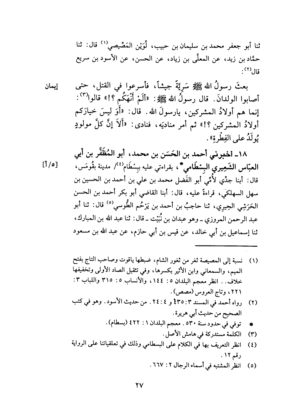 18- أخبرني أحمد بن الحسن بن محمد أبو المظفر بن أبي العباس الشعيري البسطامي بقراءتي عليه ببسطام مدينة بقومس قال أبنا جدي لأمي أبو الفضل محمد بن علي بن أحمد بن الحسين بن سهل السهلكي قراءة عليه قال أبنا القاضي أبو بكر أحمد بن الحسن الحرشي الحيري ثنا حاجب بن أحمد بن يرحم الطوسي قال ثنا أبو عبد الرحمن المروزي وهو عبدان بن نبيت قال ثنا عبد الله بن المبارك ثنا إسماعيل بن أبي خالد عن قيس بن أبي حازم عن عبد الله بن مسعود -[28]- قال قال رسول الله صلى الله عليه وسلم لا حسد إلا في اثنتين رجل آتاه الله مالا فسلطه الله على هلكته في الحق ورجل آتاه الله حكمة فهو يقضي بها ويعلمها.